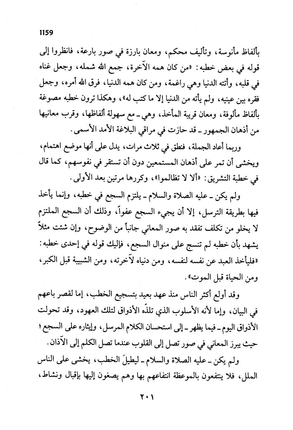 وقد أولع أكثر الناس منذ عهد بعيد بتسجيع الخطب، إما لقصر باعهم في البيان، وإما لأنه الأسلوب الذي تلذّه الأذواق لتلك العهود، وقد تحولت الأذواق اليوم - فيما يظهر - إلى استحسان الكلام المرسل، وإيثاره على السجع؛ حيث يبرز المعاني في صور تصل إلى القلوب عندما تصل الكلم إلى الآذان. ولم يكن - عليه الصلاة والسلام - ليطيلَ الخطب، يخشى على الناس الملل، فلا ينتفعون بالموعظة انتفاعهم بها وهم يصغون إليها بإقبال ونشاط،