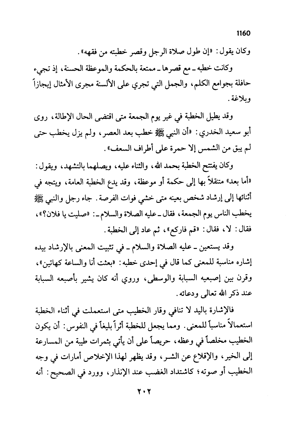 وقد يستعين - عليه الصلاة والسلام - في تثبيت المعنى بالإرشاد بيده إشاره مناسبة للمعنى كما قال في إحدى خطبه: "بعثت أنا والساعة كهاتين"، وقرن بين إصبعيه السبابة والوسطى، وروي أنه كان يشير بأصبعه السبابة عند ذكر الله تعالى ودعائه.