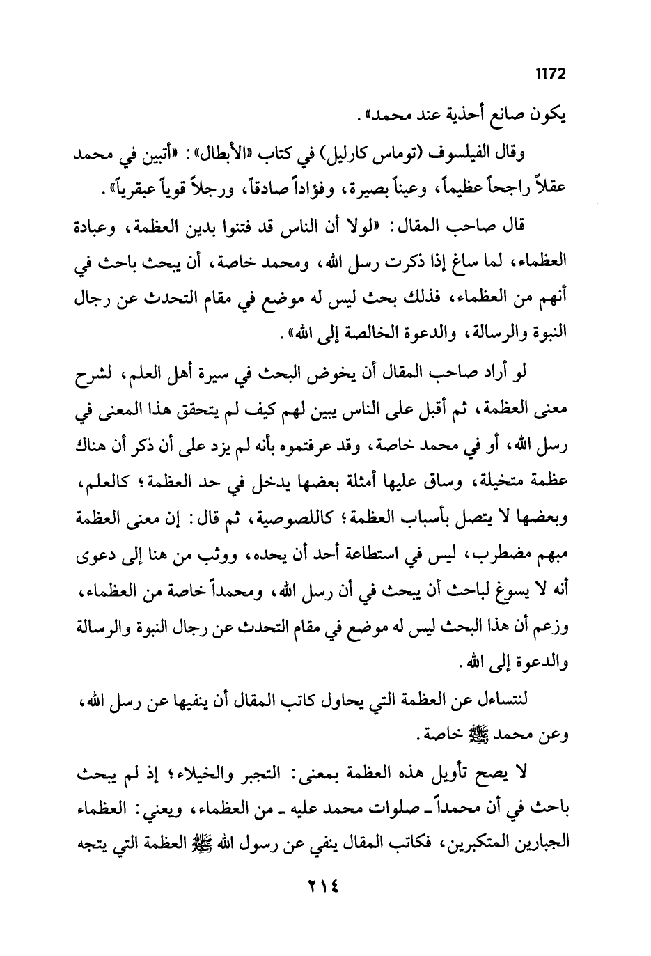 لا يصح تأويل هذه العظمة بمعنى: التجبر والخيلاء؛ إذ لم يبحث باحث في أن محمداً - صلوات الله عليه - من العظماء، ويعني: العظماء الجبارين المتكبرين، فكاتب المقال ينفي عن رسول الله - صلى الله عليه وسلم - العظمة التي يتجه