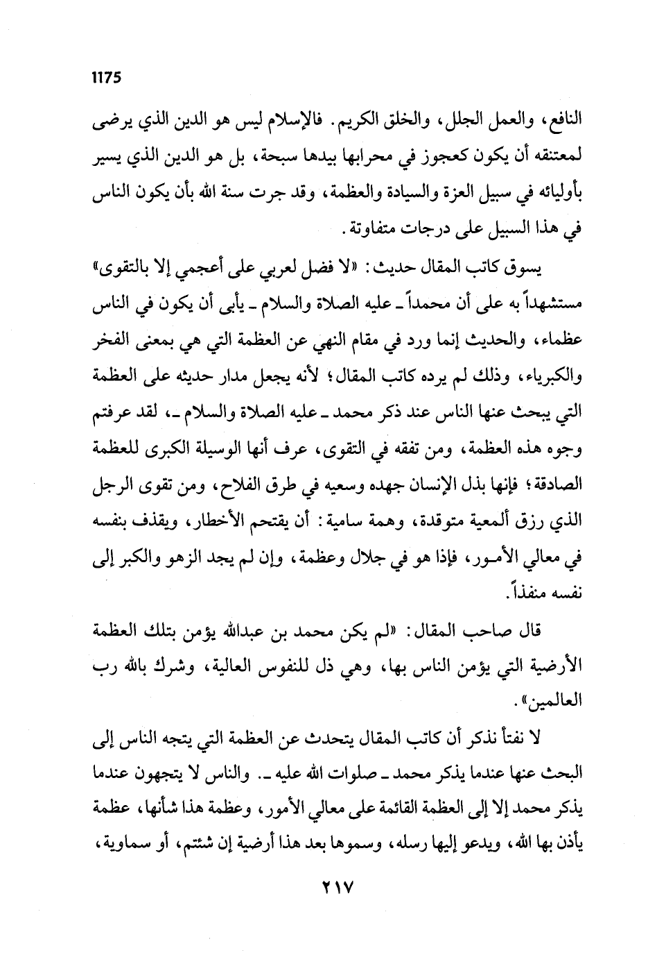 يسوق كاتب المقال حديث: "لا فضل لعربي على أعجمي إلا بالتقوى" مستشهدًا به على أن محمداً - عليه الصلاة والسلام - يأبى أن يكون في الناس عظماء، والحديث إنما ورد في مقام النهي عن العظمة التي هي بمعنى الفخر والكبرياء، وذلك لم يرده كاتب المقال؛ لأنه يجعل مدار حديثه على العظمة التي يبحث عنها الناس عند ذكر محمد - عليه الصلاة والسلام -، لقد عرفتم وجوه هذه العظمة، ومن تفقه في التقوى، عرف أنها الوسيلة الكبرى للعظمة الصادقة؛ فإنها بذل الإنسان جهده وسعيه في طرق الفلاح، ومن تقوى الرجل الذي رزق ألمعية متوقدة، وهمة سامية: أن يقتحم الأخطار، ويقذف بنفسه في معالي الأمور، فإذا هو في جلال وعظمة، وإن لم يجد الزهو والكبر إلى نفسه منفذاً.