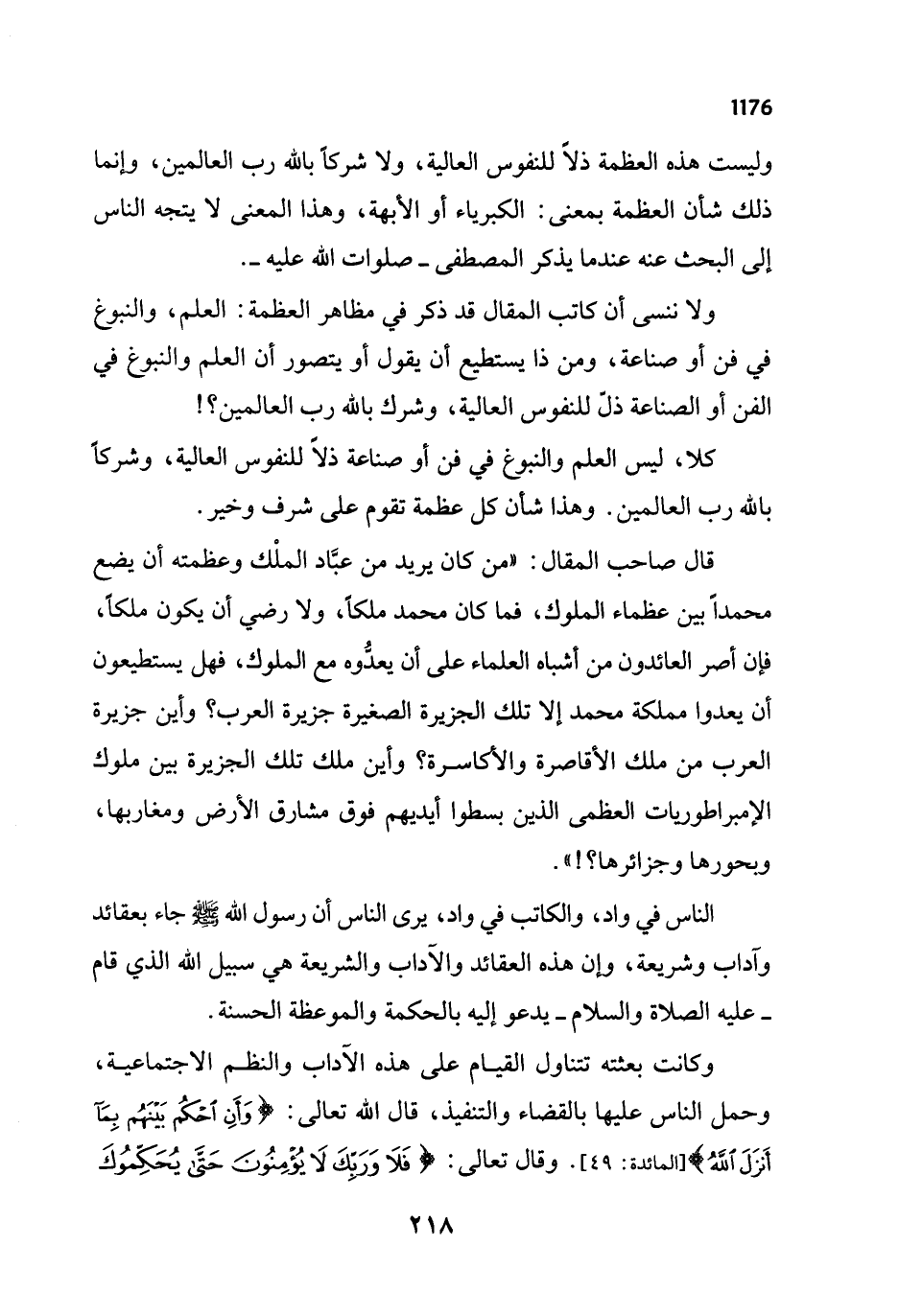 الناس في واد، والكاتب في واد، يرى الناس أن رسول الله - صلى الله عليه وسلم - جاء بعقائد وآداب وشريعة، وإن هذه العقائد والآداب والشريعة هي سبيل الله الذي قام - عليه الصلاة والسلام - يدعو إليه بالحكمة والموعظة الحسنة.