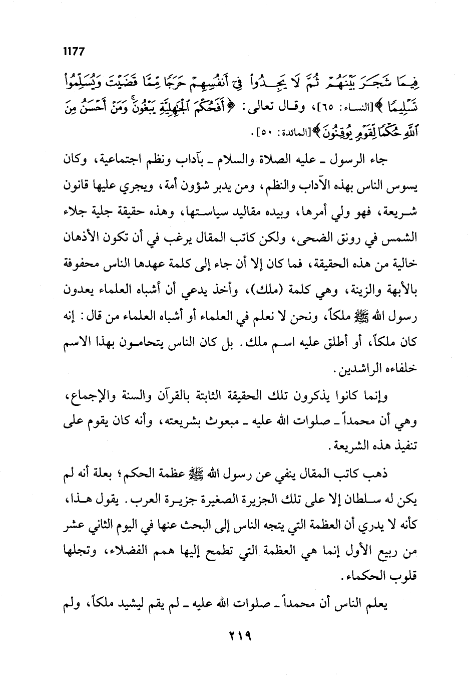جاء الرسول - عليه الصلاة والسلام - بآداب ونظم اجتماعية، وكان يسوس الناس بهذه الآداب والنظم، ومن يدبر شؤون أمة، ويجري عليها قانون شريعة، فهو ولي أمرها، وبيده مقاليد سياستها، وهذه حقيقة جلية جلاء الشمس في رونق الضحى، ولكن كاتب المقال يرغب في أن تكون الأذهان خالية من هذه الحقيقة، فما كان إلا أن جاء إلى كلمة عهدها الناس محفوفة بالأبهة والزينة، وهي كلمة (ملك)، وأخذ يدعي أن أشباه العلماء يعدون رسول الله - صلى الله عليه وسلم - ملكاً، ونحن لا نعلم في العلماء أو أشباه العلماء من قال: إنه كان ملكاً، أو أطلق عليه اسم ملك. بل كان الناس يتحامون بهذا الاسم خلفاءه الراشدين.