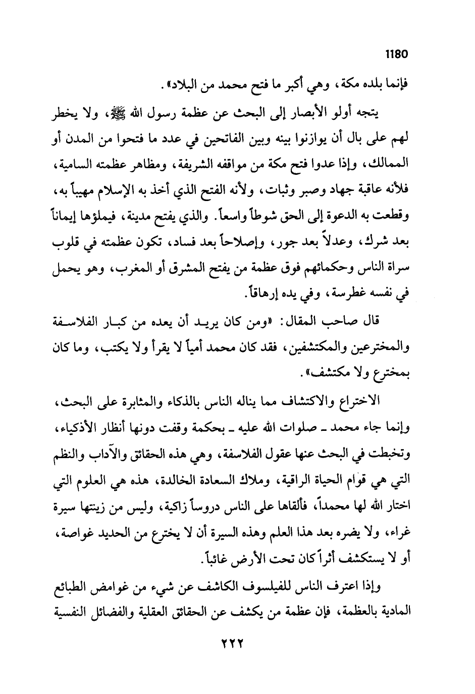 الاختراع والاكتشاف مما يناله الناس بالذكاء والمثابرة على البحث، وإنما جاء محمد - صلوات الله عليه - بحكمة وقفت دونها أنظار الأذكياء، وتخبطت في البحث عنها عقول الفلاسفة، وهي هذه الحقائق والآداب والنظم التي هي قوام الحياة الراقية، وملاك السعادة الخالدة، هذه هي العلوم التي اختار الله لها محمداً، فألقاها على الناس دروساً زكية، وليس من زينتها سيرة غراء، ولا يضره بعد هذا العلم وهذه السيرة أن لا يخترع من الحديد غواصة، أو لا يستكشف أثراً كان تحت الأرض غائباً.
