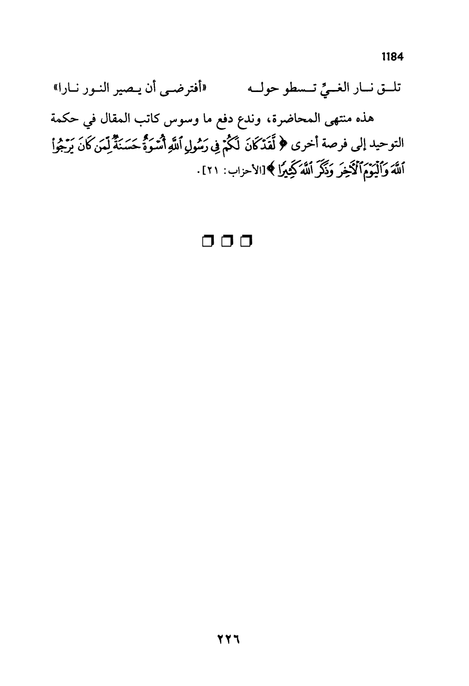 هذه منتهى المحاضرة، وندع دفع ما وسوس كاتب المقال في حكمة التوحيد إلى فرصة أخرى {لَقَدْ كَانَ لَكُمْ فِي رَسُولِ اللَّهِ أُسْوَةٌ حَسَنَةٌ لِمَنْ كَانَ يَرْجُو اللَّهَ وَالْيَوْمَ الْآخِرَ وَذَكَرَ اللَّهَ كَثِيرًا} [الأحزاب: 21]