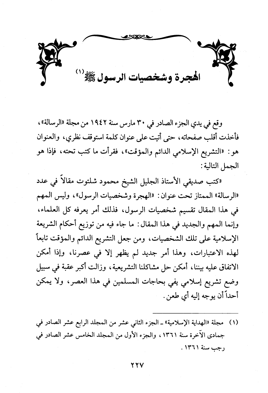 "كتب صديقي الأستاذ الجليل الشيخ محمود شلتوت مقالاً في عدد "الرسالة" الممتاز تحت عنوان: "الهجرة وشخصيات الرسول"، وليس المهم في هذا المقال تقسيم شخصيات الرسول، فذلك أمر يعرفه كل العلماء، وإنما المهم والجديد في هذا المقال: ما جاء فيه من توزيع أحكام الشريعة الإِسلامية على تلك الشخصيات، ومن جعل التشريع الدائم والمؤقت تابعاً لهذه الاعتبارات، وهذا أمر جديد لم يظهر إلا في عصرنا، وإذا أمكن الاتفاق عليه بيننا، أمكن حل مشاكلنا التشريعية، وزالت أكبر عقبة في سبيل وضع تشريع إسلامي يفي بحاجات المسلمين في هذا العصر، ولا يمكن أحداً أن يوجه إليه أي طعن.