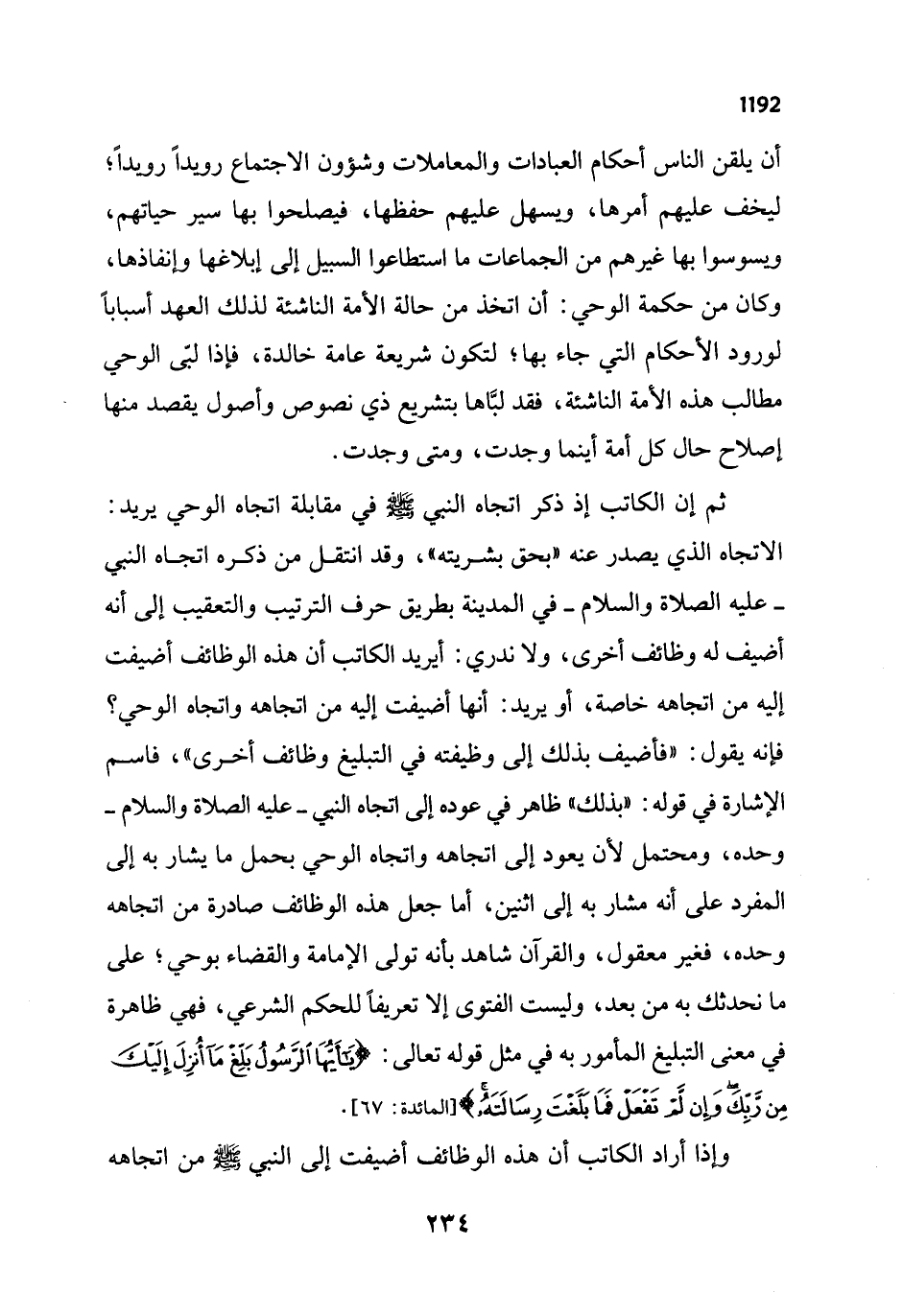 ثم إن الكاتب إذ ذكر اتجاه النبي - صلى الله عليه وسلم - في مقابلة اتجاه الوحي يريد: الاتجاه الذي يصدر عنه "بحق بشريته"، وقد انتقل من ذكره اتجاه النبي - عليه الصلاة والسلام - في المدينة بطريق حرف الترتيب والتعقيب إلى أنه أضيف له وظائف أخرى، ولا ندري: أيريد الكاتب أن هذه الوظائف أضيفت إليه من اتجاهه خاصة، أو يريد: أنها أضيفت إليه من اتجاهه واتجاه الوحي؟ فإنه يقول: "فأضيف بذلك إلى وظيفته في التبليغ وظائف أخرى"، فاسم الإشارة في قوله: "بذلك" ظاهر في عوده إلى اتجاه النبي - عليه الصلاة والسلام - وحده، ومحتمل لأن يعود إلى اتجاهه واتجاه الوحي بحمل ما يشار به إلى المفرد على أنه مشار به إلى اثنين، أما جعل هذه الوظائف صادرة من اتجاهه وحده، فغير معقول، والقرآن شاهد بأنه تولى الإمامة والقضاء بوحي؛ على ما نحدثك به من بعد، وليست الفتوى إلا تعريفًا للحكم الشرعي، فهي ظاهرة في معنى التبليغ المأمور به في مثل قوله تعالى: {يَاأَيُّهَا الرَّسُولُ بَلِّغْ مَا أُنْزِلَ إِلَيْكَ مِنْ رَبِّكَ وَإِنْ لَمْ تَفْعَلْ فَمَا بَلَّغْتَ رِسَالَتَهُ} [المائدة: 67].