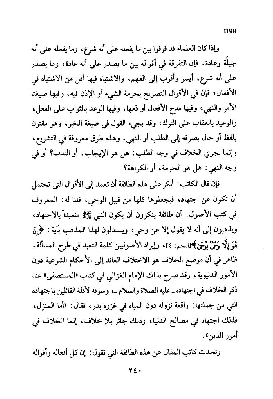 فإن قال الكاتب: أنكر على هذه الطائفة أن تعمد إلى الأقوال التي تحتمل أن تكون عن اجتهاد، فيجعلوها كلها من قبيل الوحي، قلنا له: المعروف في كتب الأصول: أن طائفة ينكرون أن يكون النبي - صلى الله عليه وسلم - متعبداً بالاجتهاد، ويذهبون إلى أنه لا يقول إلا عن وحي، ويستدلون لهذا المذهب بآية: {إِنْ هُوَ إِلَّا وَحْيٌ يُوحَى} [النجم: 4]، وإيراد الأصوليين كلمة التعبد في طرح المسألة، ظاهر في أن موضع الخلاف هو الاختلاف العائد إلى الأحكام الشرعية دون الأمور الدنيوية، وقد صرح بذلك الإمام الغزالي في كتاب "المستصفى" عند ذى الخلاف في اجتهاده - عليه الصلاة والسلام - وسوقه لأدلة القائلين باجتهاده التي من جملتها: واقعة نزوله دون المياه في غزوة بدر، فقال: "أما المنزل، فذلك اجتهاد في مصالح الدنيا، وذلك جائز بلا خلاف، إنما الخلاف في أمور الدين".