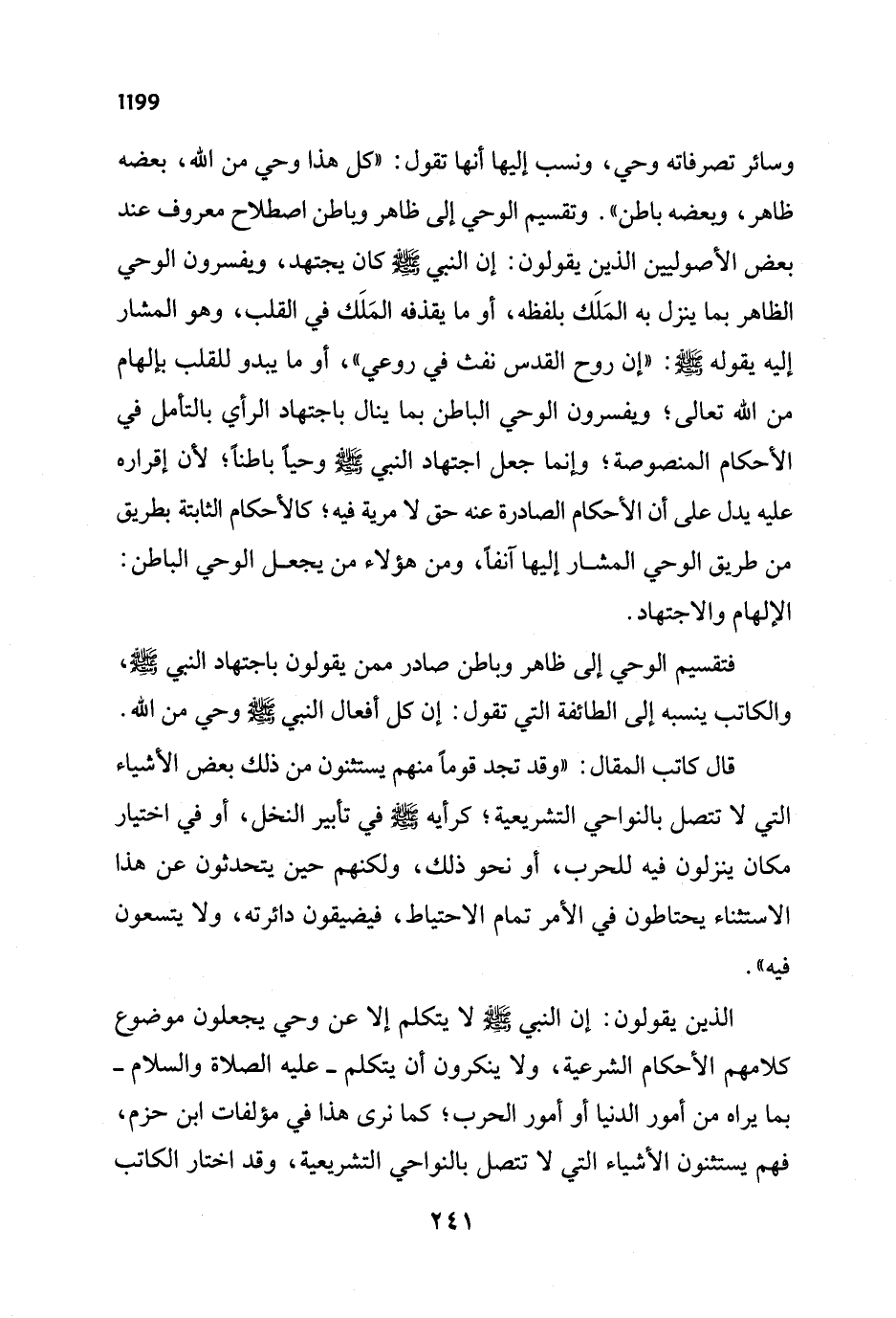 وسائر تصرفاته وحي، ونسب إليها أنها تقول: "كل هذا وحي من الله، بعضه ظاهر، وبعضه باطن". وتقسيم الوحي إلى ظاهر وباطن اصطلاح معروف عند بعض الأصوليين الذين يقولون: إن النبي - صلى الله عليه وسلم - كان يجتهد، ويفسرون الوحي الظاهر بما ينزل به المَلَك بلفظه، أو ما يقذفه المَلَك في القلب، وهو المشار إليه بقوله - صلى الله عليه وسلم -: "إن روح القدس نفث في روعي"، أو ما يبدو للقلب بإلهام من الله تعالى؛ ويفسرون الوحي الباطن بما ينال باتجهاد الرأي بالتأمل في الأحكام المنصوصة؛ وإنما جعل اجتهاد النبي - صلى الله عليه وسلم - وحيًا باطنًا؛ لأن إقراره عليه يدل على أن الأحكام الصادرة عنه حق لا مرية فيه؛ كالأحكام الثابتة بطريق من طريق الوحي المشار إليها آنفاً، ومن هؤلاء من يجعل الوحي الباطن: الإلهام والاجتهاد.