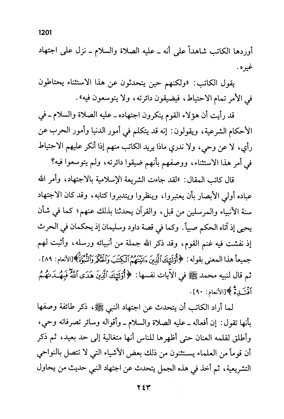 قال كاتب المقال: "لقد جاءت الشريعة الإِسلامية بالاجتهاد، وأمر الله عباده أولي الأبصار بأن يعتبروا، وينظروا ويتدبروا كتابه، وقد كان الاجتهاد سنة الأنبياء والمرسلين من قبل، والقرآن يحدثنا بذلك عنهم؛ كما في شأن يحيى إذ آتاه الحكم صبيًا. وكما في قصة داود وسليمان إذ يحكمان في الحرث إذ نفشت فيه غنم القوم، وقد ذكر الله جملة من أنبيائه ورسله، وأثبت لهم جميعاً هذا المعنى بقوله: {أُولَئِكَ الَّذِينَ آتَيْنَاهُمُ الْكِتَابَ وَالْحُكْمَ وَالنُّبُوَّةَ} [الأنعام: 89]. ثم قال لنبيه محمد - صلى الله عليه وسلم - في الآيات نفسها: {أُولَئِكَ الَّذِينَ هَدَى اللَّهُ فَبِهُدَاهُمُ اقْتَدِهْ} [الأنعام: 90].