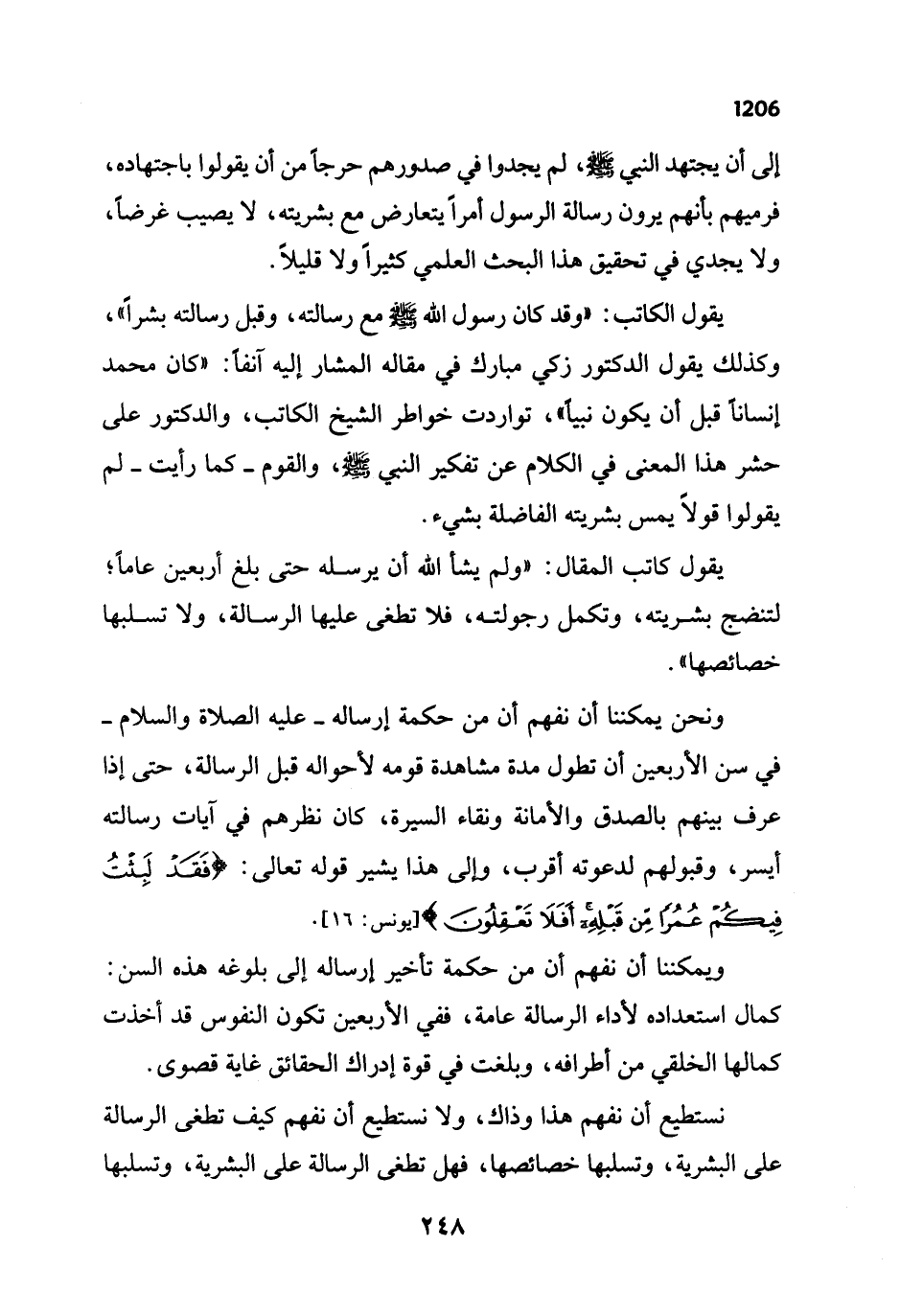 يقول كاتب المقال: "ولم يشأ الله أن يرسله حتى بلغ أربعين عاماً؛ لتنضج بشريته، وتكمل رجولته، فلا تطغى عليها الرسالة، ولا تسلبها خصائصها".