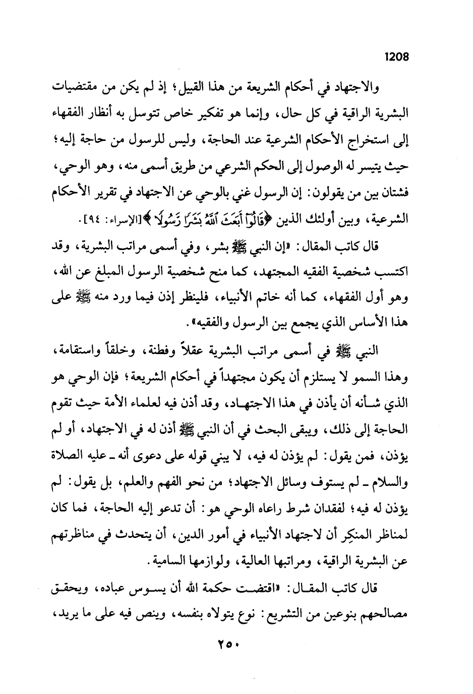 النبي - صلى الله عليه وسلم - في أسمى مراتب البشرية عقلاً وفطنة، وخلقاً واستقامة، وهذا السمو لا يستلزم أن يكون مجتهداً في أحكام الشريعة؛ فإن الوحي هو الذي شأنه أن يأذن في هذا الاجتهاد، وقد أذن فيه لعلماء الأمة حيث تقوم الحاجة إلى ذلك، ويبقى البحث في أن النبي - صلى الله عليه وسلم - أذن له في الاجتهاد، أو لم يؤذن، فمن يقول: لم يؤذن له فيه، لا يبني قوله على دعوى أنه - عليه الصلاة والسلام - لم يستوف وسائل الاجتهاد, من نحو الفهم والعلم، بل يقول: لم يؤذن له فيه؛ لفقدان شرط راعاه الوحي هو: أن تدعو إليه الحاجة، فما كان لمناظر المنكِر أن لاجتهاد الأنبياء في أمور الدين، أن يتحدث في مناظرتهم عن البشرية الراقية، ومراتبها العالية، ولوازمها السامية.