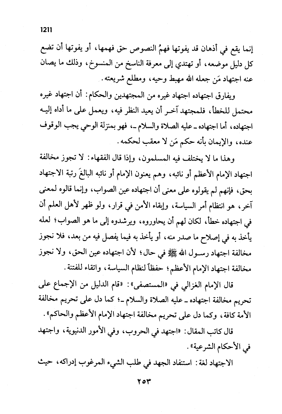 وهذا ما لا يختلف فيه المسلمون، وإذا قال الفقهاء: لا تجوز مخالفة اجتهاد الإمام الأعظم أو نائبه، وهم يعنون الإمام أو نائبه البالغَ رتبة الاجتهاد بحق، فإنهم لم يقولوه على معنى أن اجتهاده عين الصواب، وإنما قالوه لمعنى آخر، هو انتظام أمر السياسة، وإبقاء الأمن في قرار، ولو ظهر لأهل العلم أن في اجتهاده خطأ، لكان لهم أن يحاوروه، ويرشدوه إلى ما هو الصواب؛ لعله يأخذ به في إصلاح ما صدر منه، أو يأخذ به فيما يفصل فيه من بعد، فلا نجوز مخالفة اجتهاد رسول الله - صلى الله عليه وسلم - في حال؛ لأن اجتهاده عين الحق، ولا نجوز مخالفة اجتهاد الإمام الأعظم؛ حفظاً لنظام السياسة، واتقاء للفتنة.