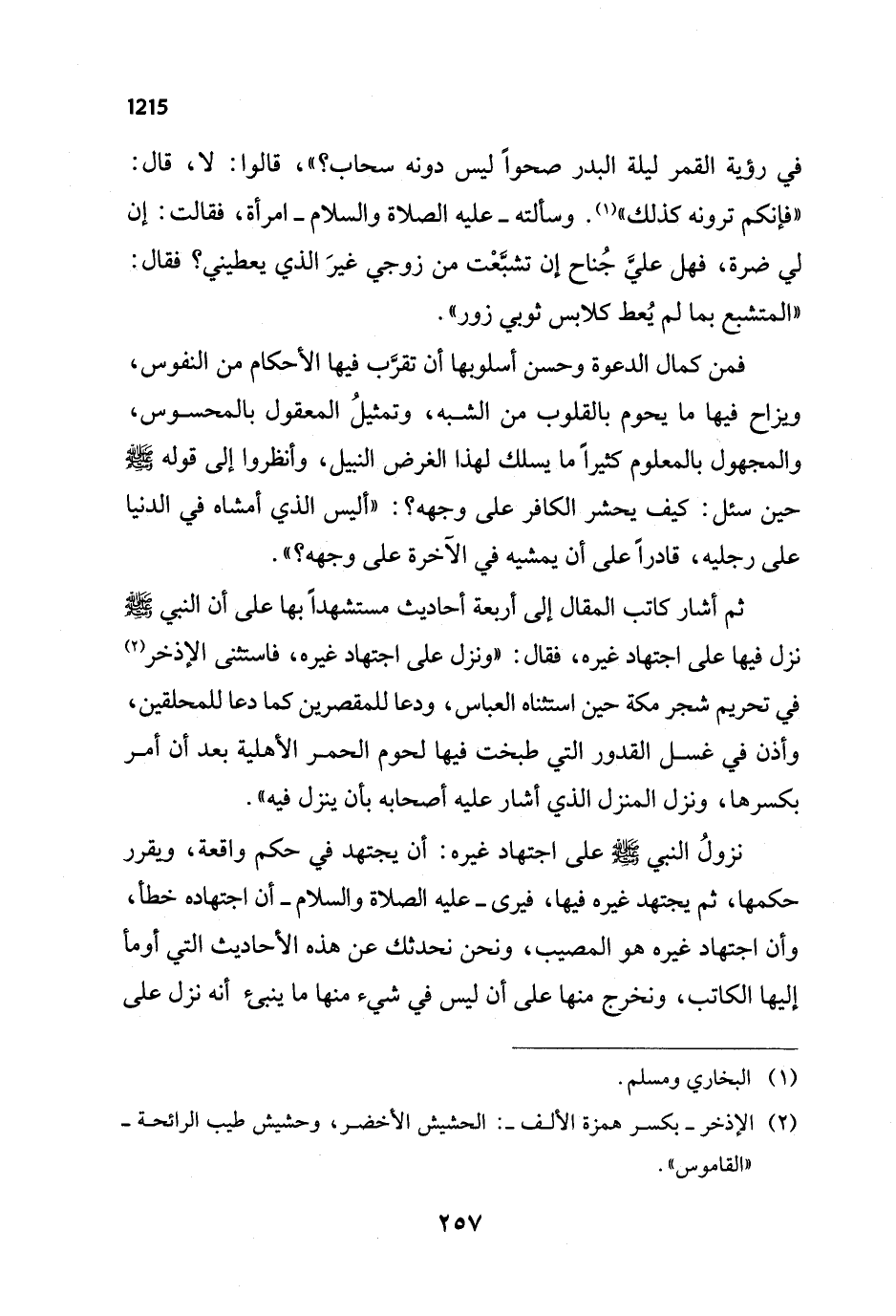 ثم أشار كاتب المقال إلى أربعة أحاديث مستشهداً بها على أن النبي - صلى الله عليه وسلم - نزل فيها على اجتهاد غيره، فقال: "ونزل على اجتهاد غيره، فاستثنى الإذخر (¬2) في تحريم شجر مكة حين استثناه العباس، ودعا للمقصرين كما دعا للمحلقين، وأذن في غسل القدور التي طبخت فيها لحوم الحمر الأهلية بعد أن أمر بكسرها، ونزل المنزل الذي أشار عليه أصحابه بأن ينزل فيه".
