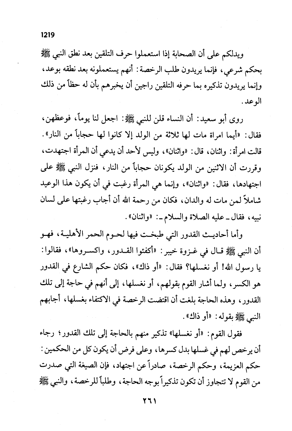 وأما أحاديث القدور التي طبخت فيها لحوم الحمر الأهلية، فهو أن النبي - صلى الله عليه وسلم - قال في غزوة خيبر: "أكفئوا القدور، واكسروها"، فقالوا: يا رسول الله! أو نغسلها؟ فقال: "أو ذاك"، فكان حكم الشارع في القدور هو الكسر، ولما أشار القوم بقولهم، أو نغسلها، إلى أنهم في حاجة إلى تلك القدور، وهذه الحاجة بلغت أن اقتضت الرخصة في الاكتفاء بغسلها، أجابهم النبي - صلى الله عليه وسلم - بقوله: "أو ذاك".