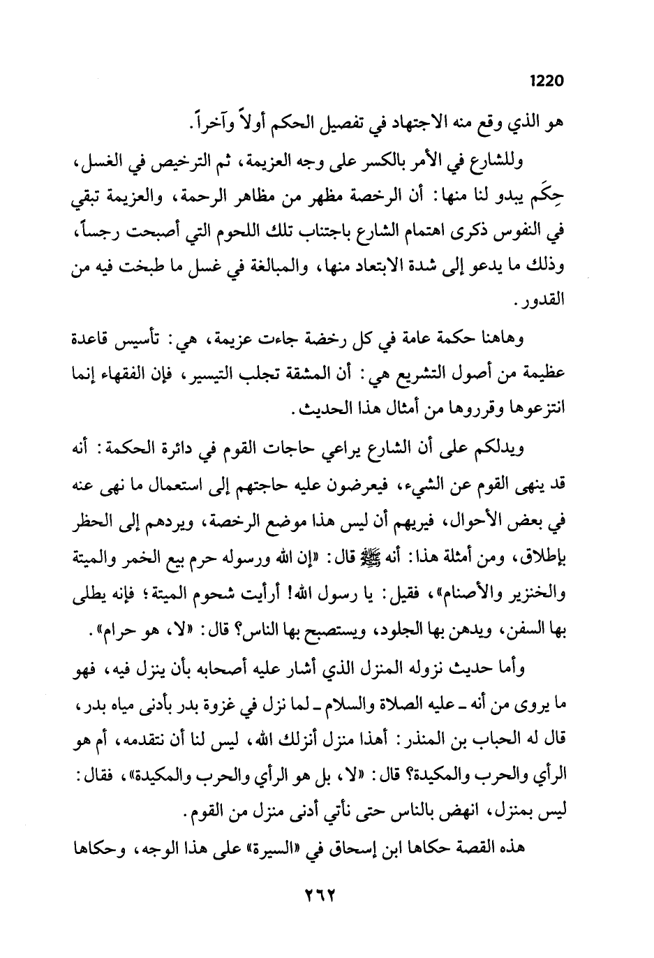 ويدلكم على أن الشارع يراعي حاجات القوم في دائرة الحكمة: أنه قد ينهى القوم عن الشيء، فيعرضون عليه حاجتهم إلى استعمال ما نهى عنه في بعض الأحوال، فيريهم أن ليس هذا موضع الرخصة، ويردهم إلى الحظر بإطلاق، ومن أمثلة هذا: أنه - صلى الله عليه وسلم - قال: "إن الله ورسوله حرم بيع الخمر والميتة والخنزير والأصنام "، فقيل: يا رسول الله! أرأيت شحوم الميتة، فإنه يطلى بها السفن، ويدهن بها الجلود، ويستصبح بها الناس؟ قال: "لا، هو حرام".