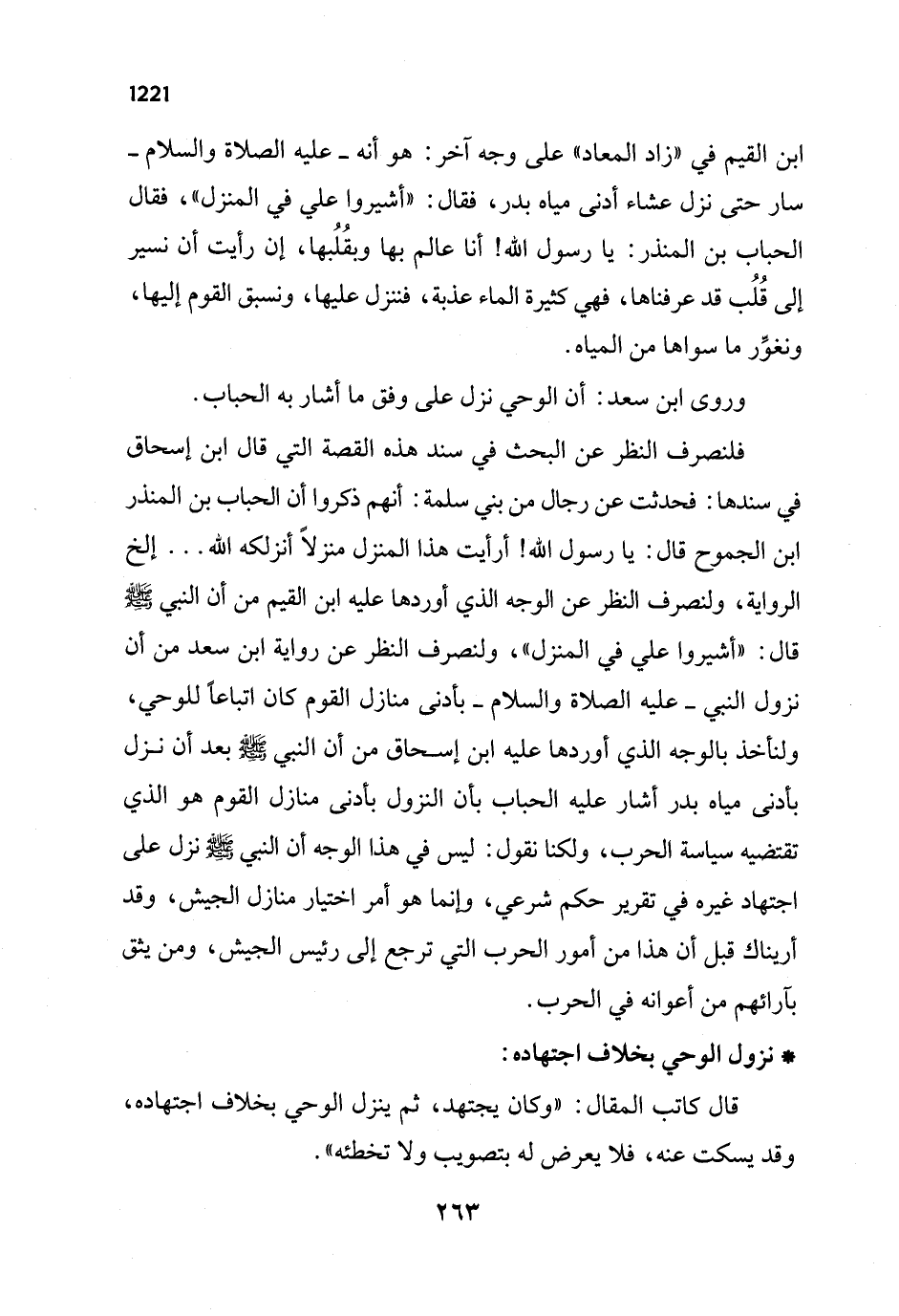 فلنصرف النظر عن البحث في سند هذه القصة التي قال ابن إسحاق في سندها: فحدثت عن رجال من بني سلمة: أنهم ذكروا أن الحباب بن المنذر ابن الجموح قال: يا رسول الله! أرأيت هذا المنزل منزلًا أنزلكه الله ... إلخ الرواية" ولنصرف النظر عن الوجه الذي أوردها عليه ابن القيم من أن النبي - صلى الله عليه وسلم - قال: "أشيروا علي في المنزل"، ولنصرف النظر عن رواية ابن سعد من أن نزول النبي - عليه الصلاة والسلام - بأدنى منازل القوم كان اتباعًا للوحي، ولنأخذ بالوجه الذي أوردها عليه ابن إسحاق من أن النبي - صلى الله عليه وسلم - بعد أن نزل بأدنى مياه بدر أشار عليه الحباب بأن النزول بأدنى منازل القوم هو الذي تقتضيه سياسة الحرب، ولكنا نقول: ليس في هذا الوجه أن النبي - صلى الله عليه وسلم - نزل على اجتهاد غيره في تقرير حكم شرعي، وإنما هو أمر اختيار منازل الجيش، وقد أريناك قبل أن هذا من أمور الحرب التي ترجع إلى رئيس الجيش، ومن يشق بآرائهم من أعوانه في الحرب.