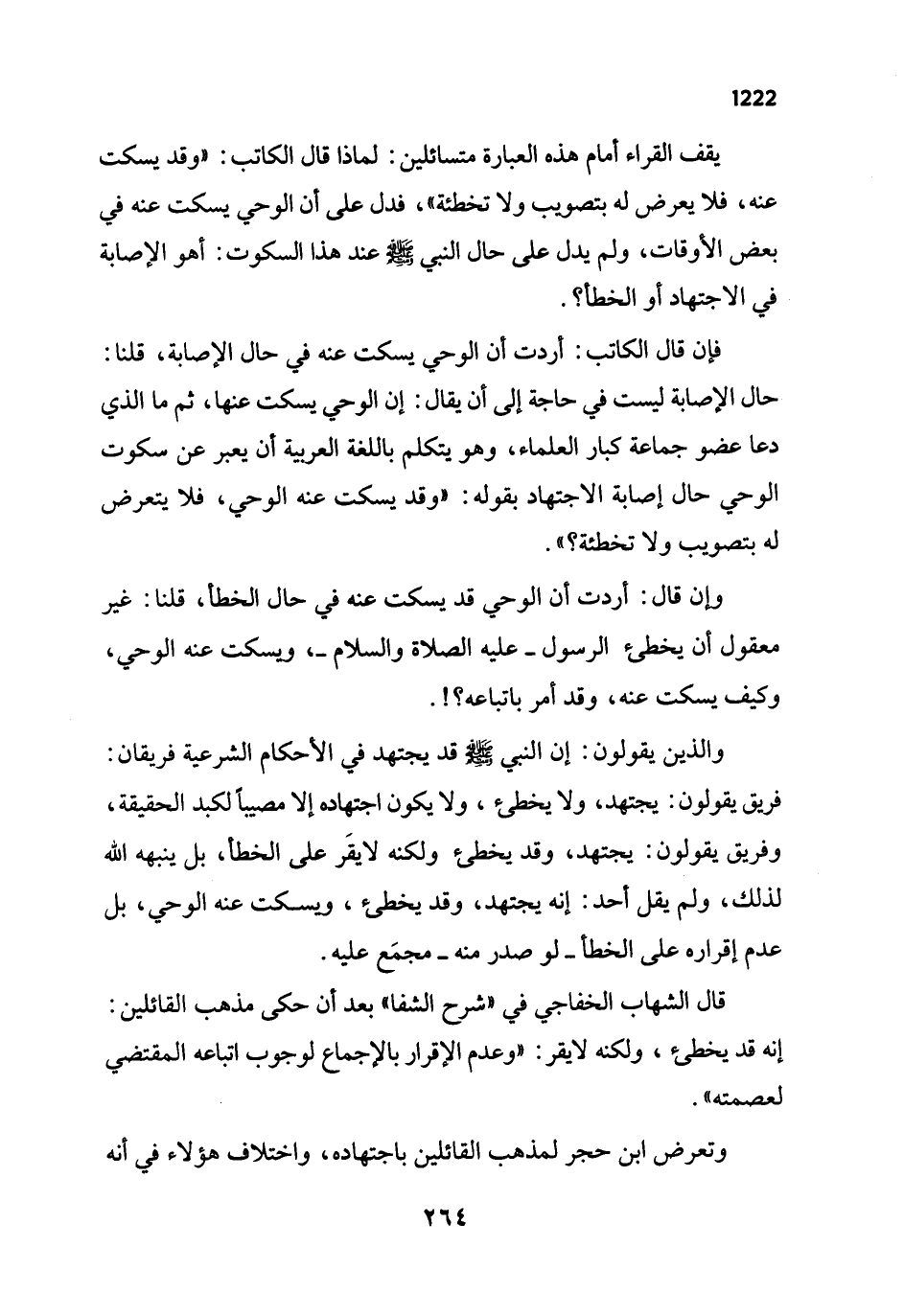 وإن قال: أردت أن الوحي قد يسكت عنه في حال الخطأ، قلنا: غير معقول أن يخطئ الرسول - عليه الصلاة والسلام - , ويسكت عنه الوحي، وكيف يسكت عنه، وقد أمر باتباعه؟!.