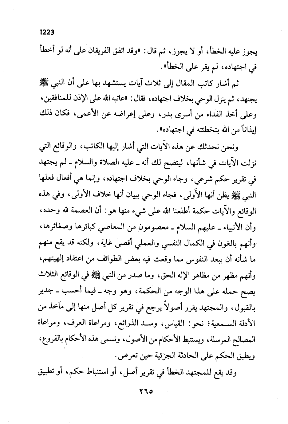 ونحن نحدثك عن هذه الآيات التي أشار إليها الكاتب، والوقائع التي نزلت الآيات في شأنها ليتضح لك أنه - عليه الصلاة والسلام - لم يجتهد في تقرير حكم شرعي، وجاء الوحي بخلاف اجتهاده، وإنما هي أفعال فعلها النبي - صلى الله عليه وسلم - يظن أنها الأَولى، فجاء الوحي ببيان أنها خلاف الأولى، وفي هذه الوقائع والآيات حكمة أطلعنا الله على شيء منها هو: أن العصمة لله وحده، وأن الأنبياء - عليهم السلام - معصومون من المعاصي كبائرها وصغائرها، وأنهم بالغون في الكمال النفسي والعملي أقصى غاية، ولكنه قد يقع منهم ما شأنه أن يبعد النفوس مما وقعت فيه بعض الطوائف من اعتقاد إلهيتهم، وأنهم مظهر من مظاهر الإله الحق، وما صدر من النبي - صلى الله عليه وسلم - في الوقائع الثلاث يصح حمله على هذا الوجه من الحكمة، وهو وجه - فيما أحسب - جدير بالقبول، والمجتهد يقرر أصولاً يرجع في تقرير كل أصل منها إلى ماَخذ من الأدلة السمعية؛ نحو: القياس، وسد الذرائع، ومراعاة العرف، ومراعاة المصالح المرسلة، ويستنبط الأحكام من الأصول، وتسمى هذه الأحكام بالفروع، ويطبق الحكم على الحادثة الجزئية حين تعرض.