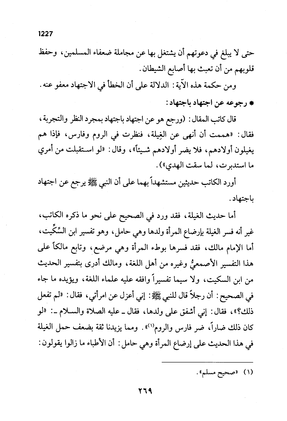 قال كاتب المقال: (ورجع هو عن اجتهاد باجتهاد بمجرد النظر والتجربة، فقال: "هممت أن أنهى عن الغِيلة، فنظرت في الروم وفارس، فإذا هم يغيلون أولادهم، فلا يضر أولادهم شيئاً"، وقال: "لو استقبلت من أمري ما استدبرت، لما سقت الهدي").