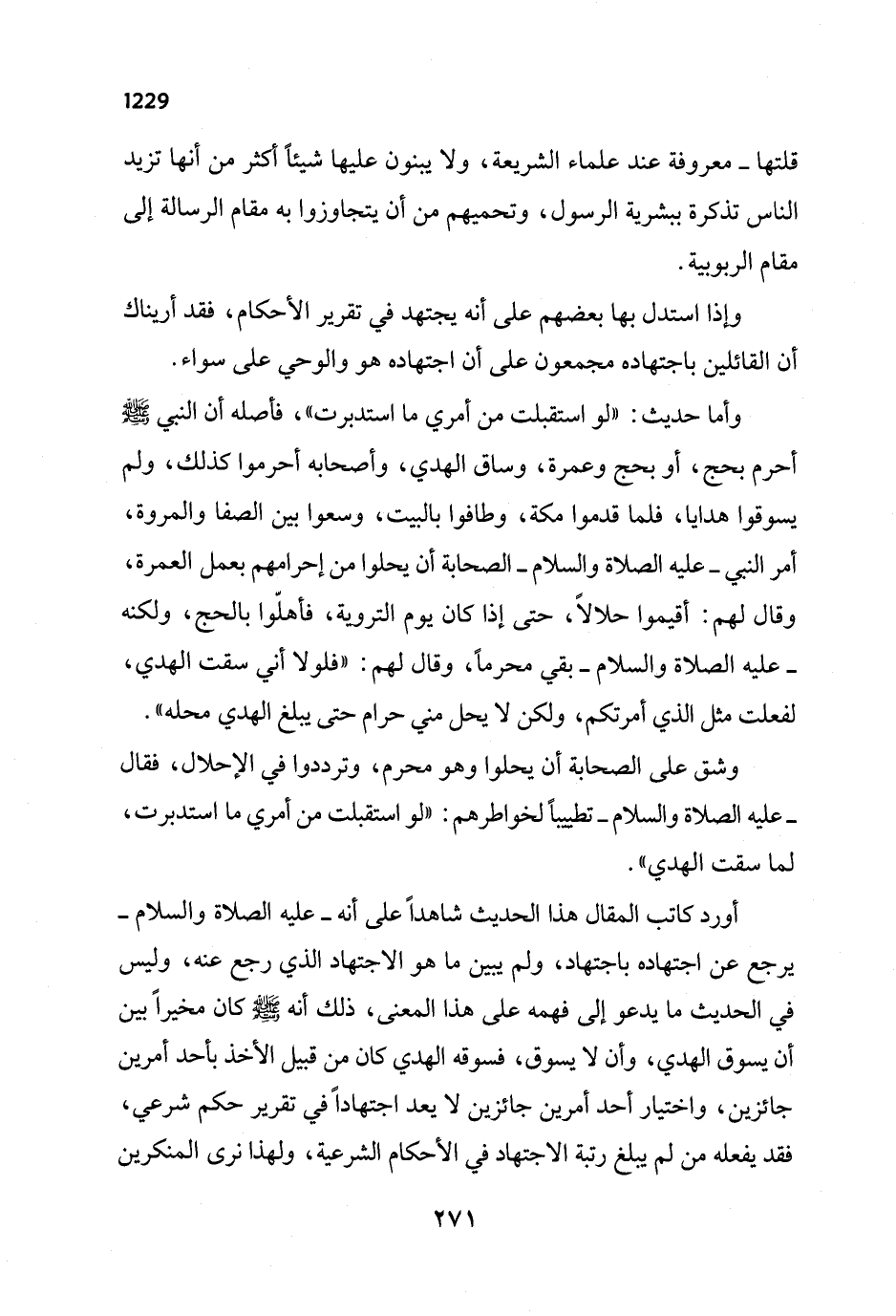 أورد كاتب المقال هذا الحديث شاهداً على أنه - عليه الصلاة والسلام - يرجع عن اجتهاده باجتهاد، ولم يبين ما هو الاجتهاد الذي رجع عنه، وليس في الحديث ما يدعو إلى فهمه على هذا المعنى، ذلك أنه - صلى الله عليه وسلم - كان مخيراً بين أن يسوق الهدي، وأن لا يسوق، فسوقه الهدي كان من قبيل الأخذ بأحد أمرين جائزين، واختيار أحد أمرين جائزين لا يعد اجتهاداً في تقرير حكم شرعي، فقد يفعله من لم يبلغ رتبة الاجتهاد في الأحكام الشرعية، ولهذا نرى المنكرين