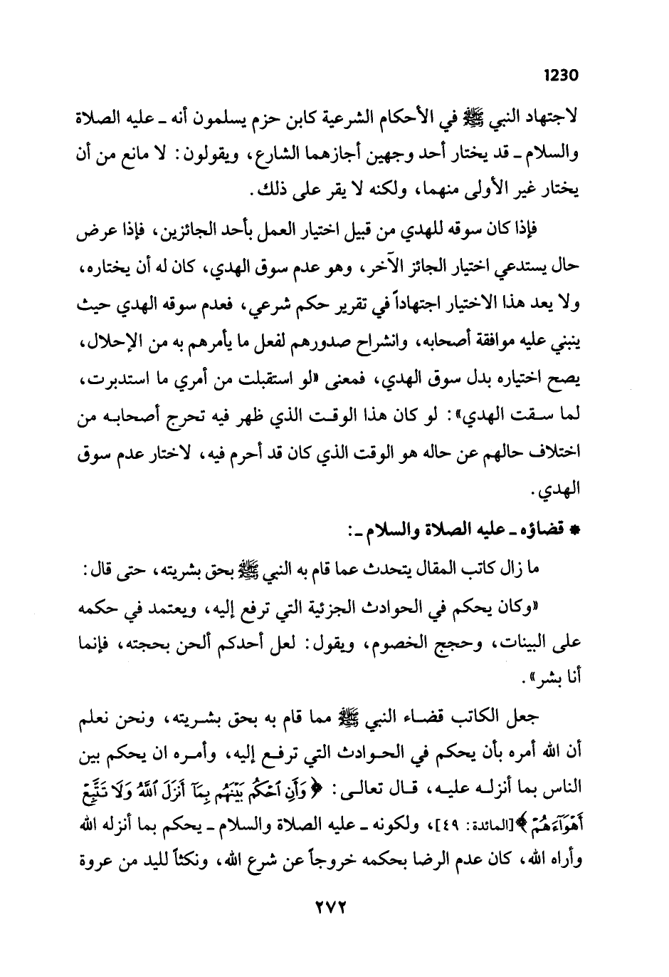 جعل الكاتب قضاء النبي - صلى الله عليه وسلم - مما قام به بحق بشريته، ونحن نعلم أن الله أمره بأن يحكم في الحوادث التي ترفع إليه، وأمره ان يحكم بين الناس بما أنزله عليه، قال تعالى: {وَأَنِ احْكُمْ بَيْنَهُمْ بِمَا أَنْزَلَ اللَّهُ وَلَا تَتَّبِعْ أَهْوَاءَهُمْ} [المائدة: 49]، ولكونه - عليه الصلاة والسلام - يحكم بما أنزله الله وأراه الله، كان عدم الرضا بحكمه خروجاً عن شرع الله، ونكثاً لليد من عروة