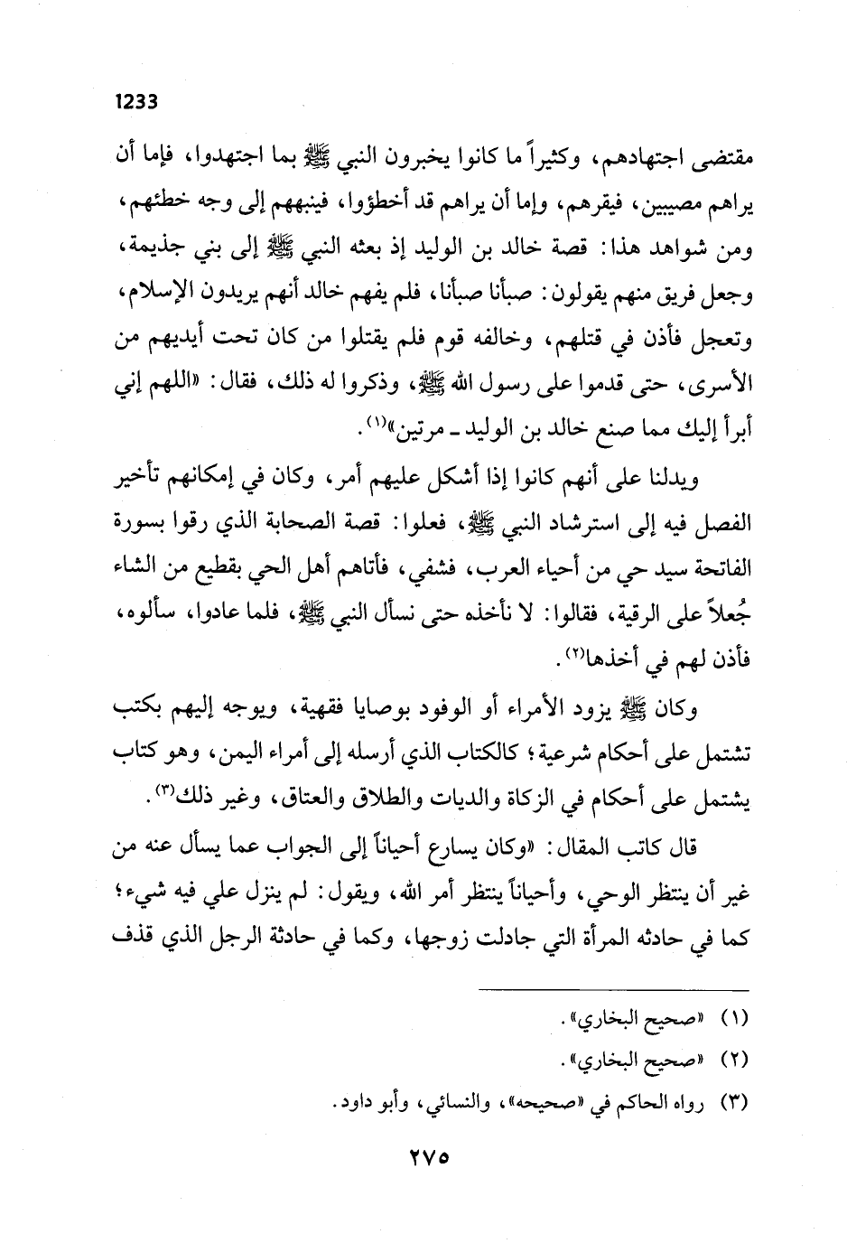 مقتضى اجتهادهم، وكثيراً ما كانوا يخبرون النبي - صلى الله عليه وسلم - بما اجتهدوا، فإما أن يراهم مصيبين، فيقرهم، وإما أن يراهم قد أخطؤوا، فينبههم إلى وجه خطئهم، ومن شواهد هذا: قصة خالد بن الوليد إذ بعثه النبي - صلى الله عليه وسلم - إلى بني جذيمة، وجعل فريق منهم يقولون: صبأنا صبأنا، فلم يفهم خالد أنهم يريدون الإِسلام، وتعجل فأذن في قتلهم، وخالفه قوم فلم يقتلوا من كان تحت أيديهم من الأسرى، حتى قدموا على رسول الله - صلى الله عليه وسلم -، وذكروا له ذلك، فقال: "اللهم إني أبرأ إليك مما صنع خالد بن الوليد - مرتين" (¬1).