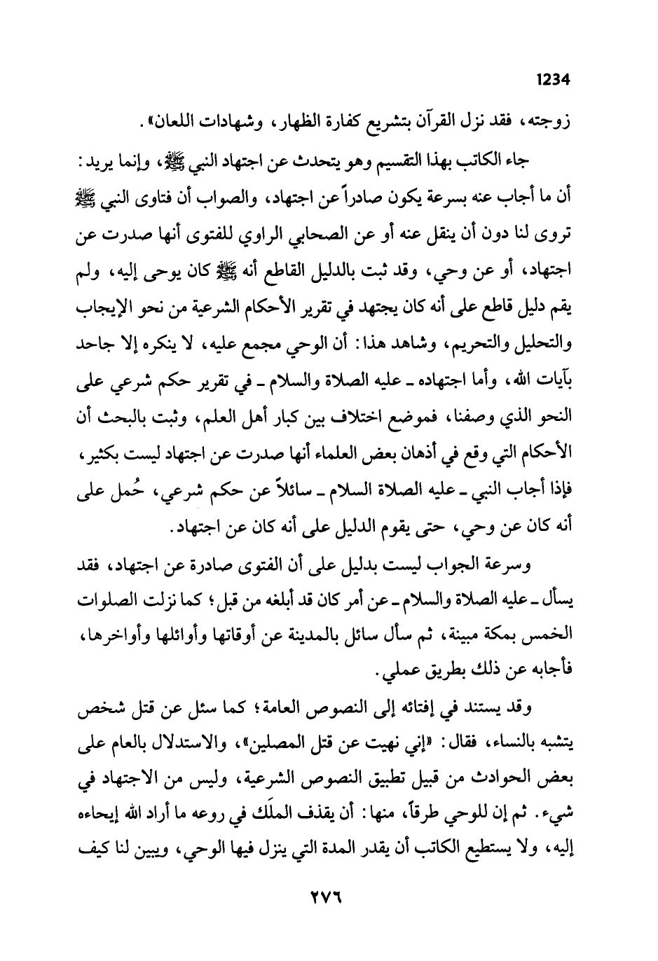 جاء الكاتب بهذا التقسيم وهو يتحدث عن اجتهاد النبي - صلى الله عليه وسلم -، وإنما يريد: أن ما أجاب عنه بسرعة يكون صادراً عن اجتهاد، والصواب أن فتاوى النبي - صلى الله عليه وسلم - تروى لنا دون أن ينقل عنه أو عن الصحابي الراوي للفتوى أنها صدرت عن اجتهاد، أو عن وحي، وقد ثبت بالدليل القاطع أنه - صلى الله عليه وسلم - كان يوحى إليه، ولم يقم دليل قاطع على أنه كان يجتهد في تقرير الأحكام الشرعية من نحو الإيجاب والتحليل والتحريم، وشاهد هذا: أن الوحي مجمع عليه، لا ينكره إلا جاحد بآيات الله، وأما اجتهاده - عليه الصلاة والسلام - في تقرير حكم شرعي على النحو الذي وصفنا، فموضع اختلاف بين كبار أهل العلم، وثبت بالبحث أن الأحكام التي وقع في أذهان بعض العلماء أنها صدرت عن اجتهاد ليست بكثير، فإذا أجاب النبي - صلى الله عليه وسلم -عليه الصلاة السلام - سائلًا عن حكم شرعي، حُمل على أنه كان عن وحي، حتى يقوم الدليل على أنه كان عن اجتهاد.