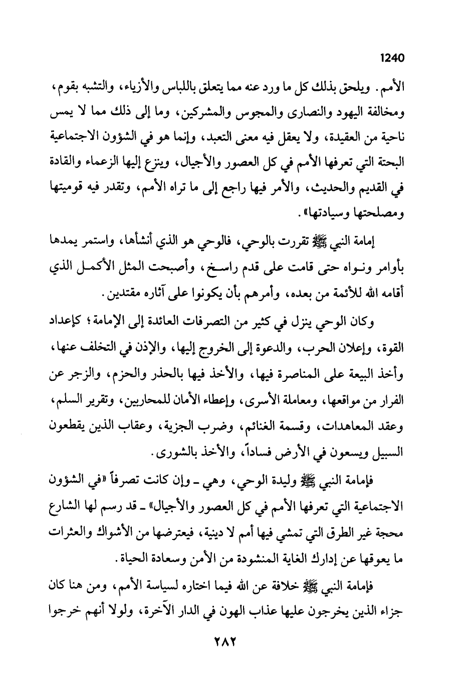 فإمامة النبي - صلى الله عليه وسلم - وليدة الوحي، وهي - وإن كانت تصرفاً "في الشؤون الاجتماعية التي تعرفها الأمم في كل العصور والأجيال"- قد رسم لها الشارع محجة غير الطرق التي تمشي فيها أمم لا دينية، فيعترضها من الأشواك والعثرات ما يعوقها عن إدارك الغاية المنشودة من الأمن وسعادة الحياة.