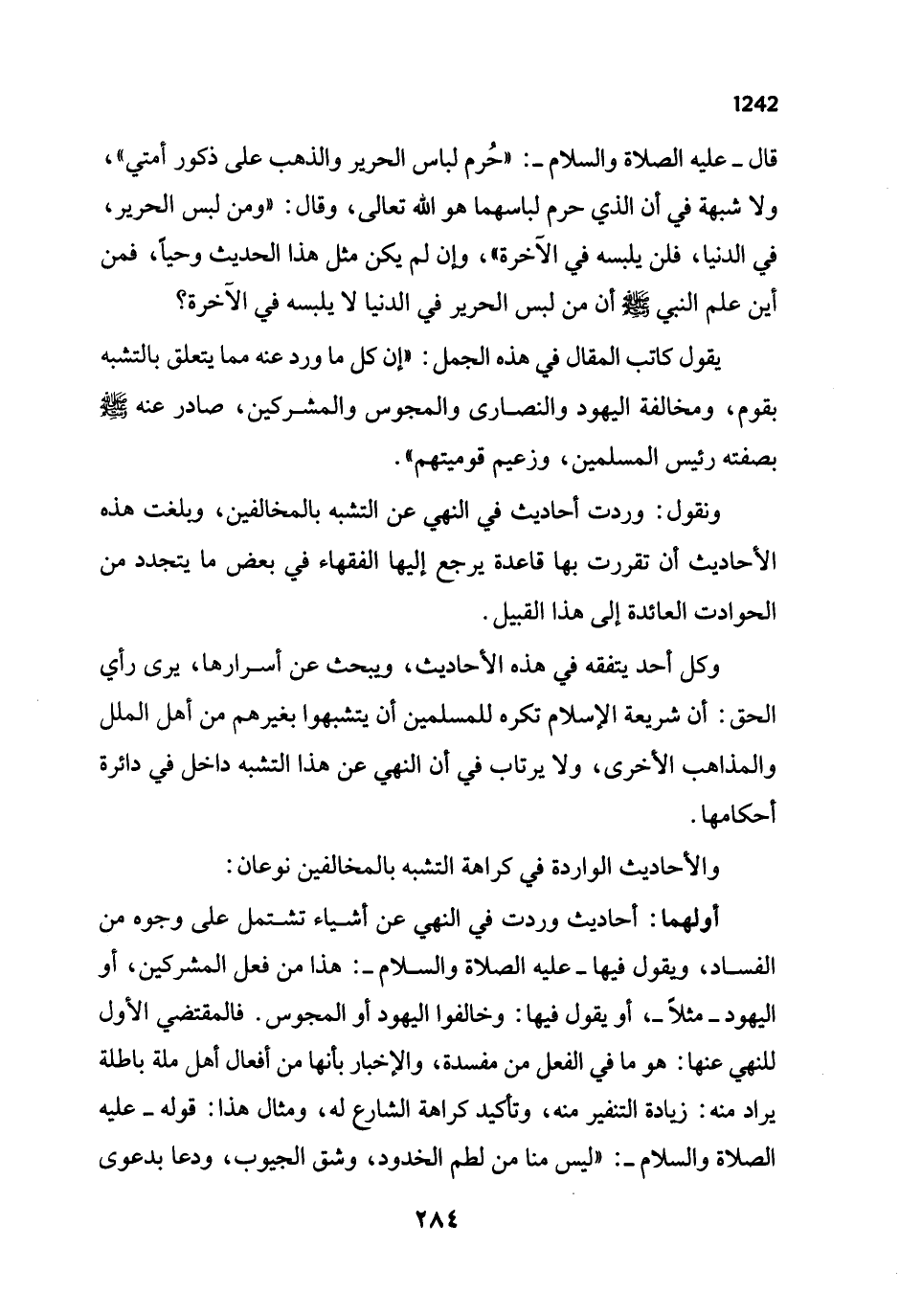 ونقول: وردت أحاديث في النهي عن التشبه بالمخالفين، ويلغت هذه الأحاديث أن تقررت بها قاعدة يرجع إليها الفقهاء في بعض ما يتجدد من الحوادت العائدة إلى هذا القبيل.