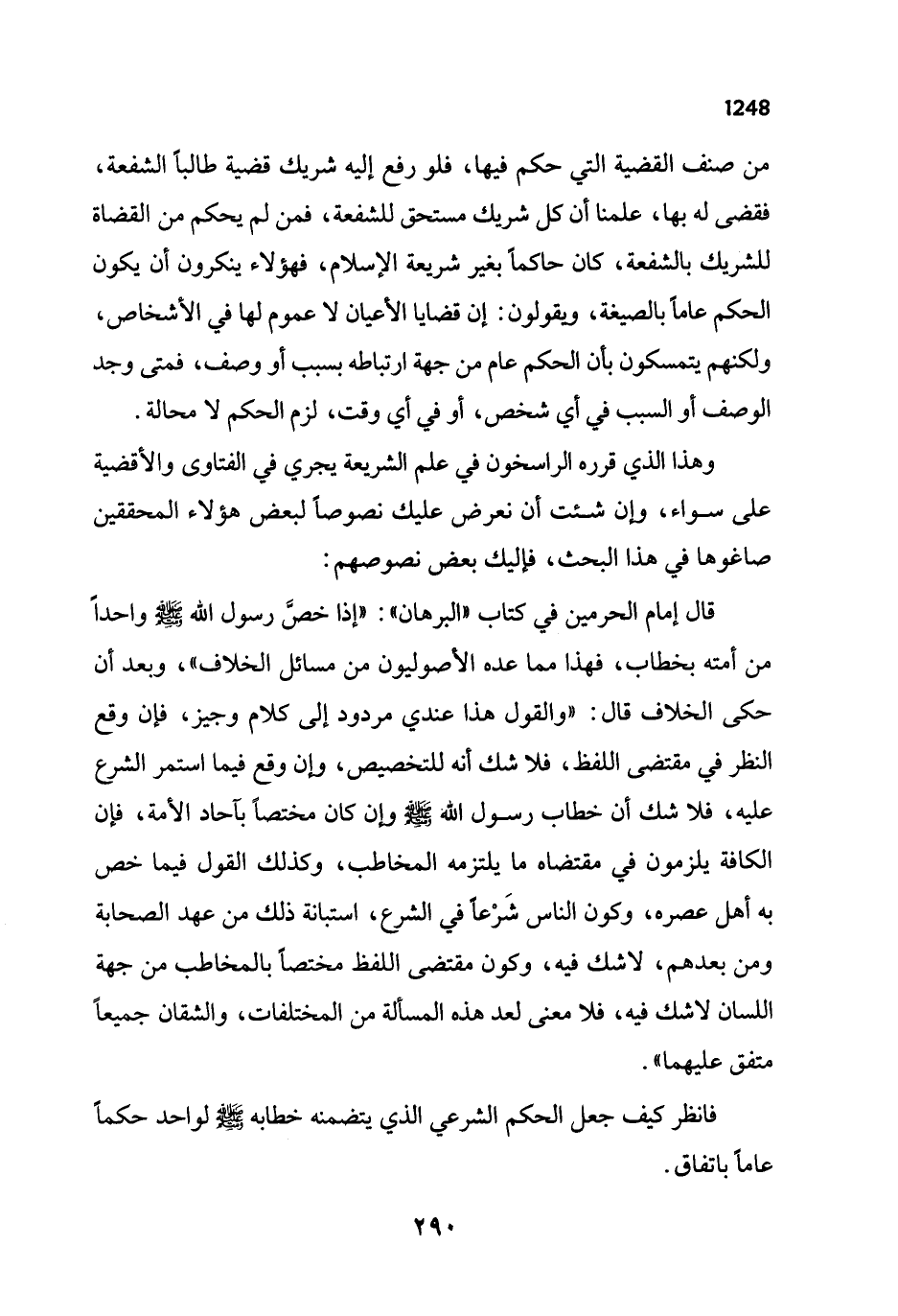قال إمام الحرمين في كتاب "البرهان": "إذا خصَّ رسول الله - صلى الله عليه وسلم - واحداً من أمته بخطاب، فهذا مما عده الأصوليون من مسائل الخلاف"، وبعد أن حكى الخلاف قال: "والقول هذا عندي مردود إلى كلام وجيز، فإن وقع النظر في مقتضى اللفظ، فلا شك أنه للتخصيص، وإن وقع فيما استمر الشرع عليه، فلا شك أن خطاب رسول الله - صلى الله عليه وسلم - وإن كان مختصاً بآحاد الأمة، فإن الكافة يلزمون في مقتضاه ما يلتزمه المخاطب، وكذلك القول فيما خص به أهل عصره، وكون الناس شَرْعا في الشرع، استبانة ذلك من عهد الصحابة ومن بعدهم، لا شك فيه، وكون مقتضى اللفظ مختصًا بالمخاطب من جهة اللسان لا شك فيه، فلا معنى لعد هذه المسألة من المختلفات، والشقان جميعاً متفق عليهما".