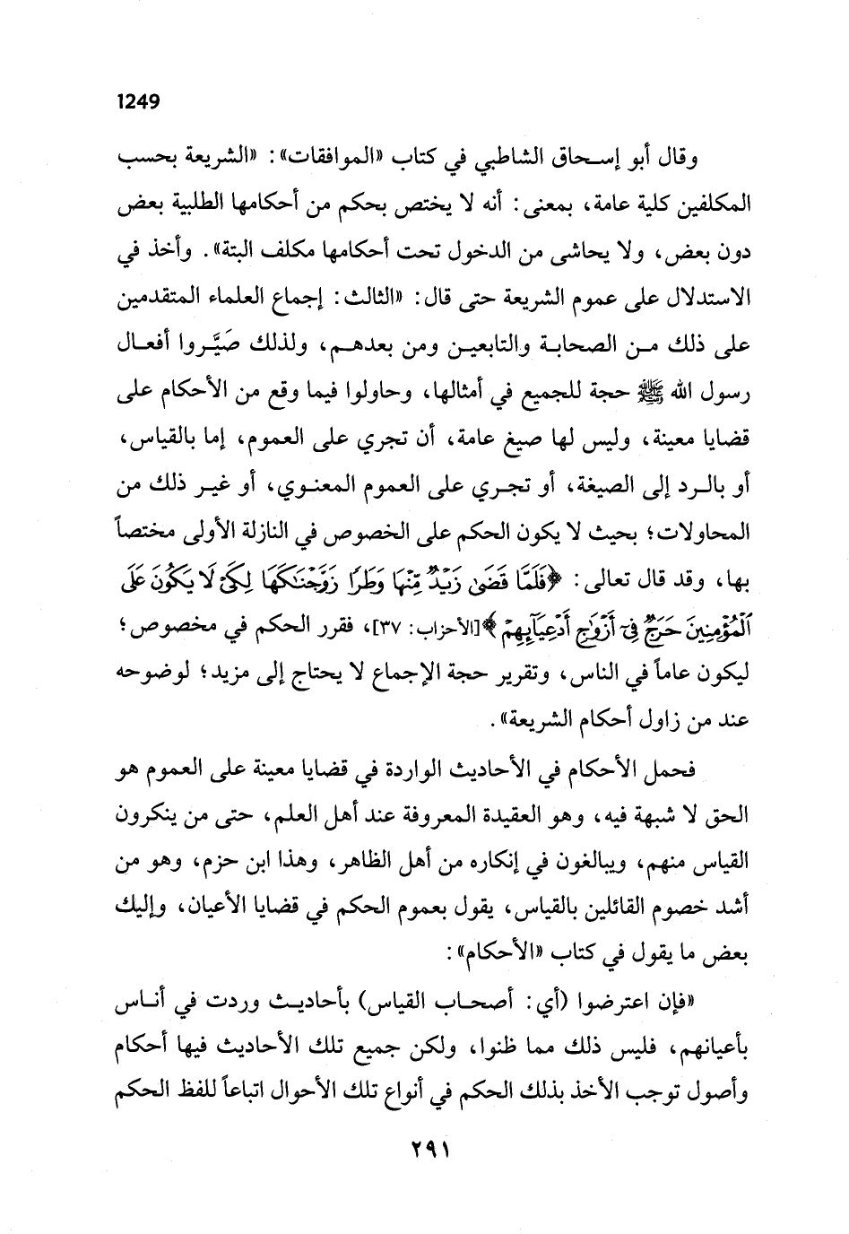 وقال أبو إسحاق الشاطبي في كتاب "الموافقات": "الشريعة بحسب المكلفين كلية عامة، بمعنى: أنه لا يختص بحكم من أحكامها الطلبية بعض دون بعض، ولا يحاشى من الدخول تحت أحكامها مكلف البتة". وأخذ في الاستدلال على عموم الشريعة حتى قال: "الثالث: إجماع العلماء المتقدمين على ذلك من الصحابة والتابعين ومن بعدهم، ولذلك صَيَّروا أفعال رسول الله - صلى الله عليه وسلم - حجة للجميع في أمثالها، وحاولوا فيما وقع من الأحكام على قضايا معينة، وليس لها صيغ عامة، أن تجري على العموم، إما بالقياس، أو بالرد إلى الصيغة، أو تجري على العموم المعنوي، أو غير ذلك من المحاولات؛ بحيث لا يكون الحكم على الخصوص في النازلة الأولى مختصًا بها، وقد قال تعالى: {فَلَمَّا قَضَى زَيْدٌ مِنْهَا وَطَرًا زَوَّجْنَاكَهَا لِكَيْ لَا يَكُونَ عَلَى الْمُؤْمِنِينَ حَرَجٌ فِي أَزْوَاجِ أَدْعِيَائِهِمْ} [الأحزاب: 37]، فقرر الحكم في مخصوص، ليكون عاماً في الناس، وتقرير حجة الإجماع لا يحتاج إلى مزيد؛ لوضوحه عند من زاول أحكام الشريعة".