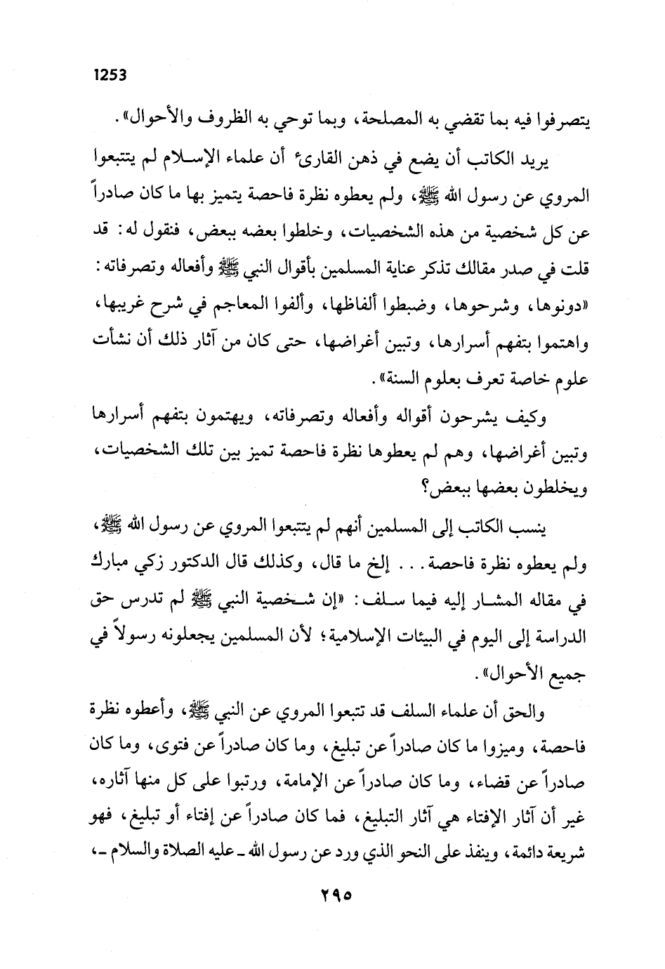 ينسب الكاتب إلى المسلمين أنهم لم يتتبعوا المروي عن رسول الله - صلى الله عليه وسلم - ولم يعطوه نظرة فاحصة ... إلخ ما قال، وكذلك قال الدكتور زكي مبارك في مقاله المشار إليه فيما سلف: "إن شخصية النبي - صلى الله عليه وسلم - لم تدرس حق الدراسة إلى اليوم في البيئات الإِسلامية؛ لأن المسلمين يجعلونه رسولاً في جميع الأحوال".