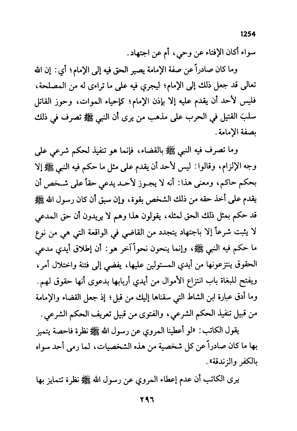 وما تصرف فيه النبي - صلى الله عليه وسلم - بالقضاء، فإنما هو تنفيذ لحكم شرعي على وجه الإلزام، وقالوا: ليس لأحد أن يقدم على مثل ما حكم فيه النبي - صلى الله عليه وسلم - إلا بحكم حاكم، ومعنى هذا: أنه لا يجوز لأحد يدعي حقاً على شخص أن يقدم على أخذ حقه من ذلك الشخص بقوة، وإن سبق أن كان رسول الله - صلى الله عليه وسلم - قد حكم بمثل ذلك الحق لمثله، يقولون هذا وهم لا يريدون أن حق المدعي لا يثبت شرعاً إلا باجتهاد يتجدد من القاضي في الواقعة التي هي من نوع ما حكم فيه النبي - صلى الله عليه وسلم -، وإنما ينحون نحواً آخر هو: أن إطلاق أيدي مدعي الحقوق ينتزعونها من أيدي المستولين عليها، يفضي إلى فتنة واختلال أمر، ويفتح للبغاة باب انتزاع الأموال من أيدي أربابها بدعوى أنها حقوق لهم. وما أدق عبارة ابن الشاط التي سقناها إليك من قبل؛ إذ جعل القضاء والإمامة من قبيل تنفيذ الحكم الشرعي، والفتوى من قبيل تعريف الحكم الشرعي.