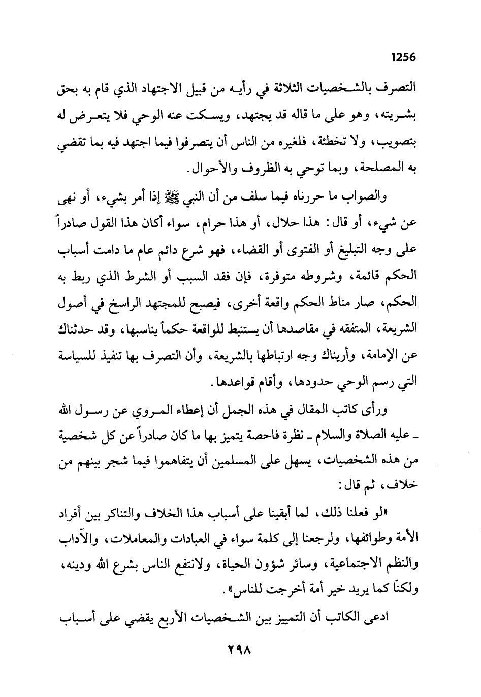 التصرف بالشخصيات الثلاثة في رأيه من قبيل الاجتهاد الذي قام به بحق بشريته، وهو على ما قاله قد يجتهد، ويسكت عنه الوحي فلا يتعرض له بتصويب، ولا تخطئة، فلغيره من الناس أن يتصرفوا فيما اجتهد فيه بما تقضي به المصلحة، وبما توحي به الظروف والأحوال.