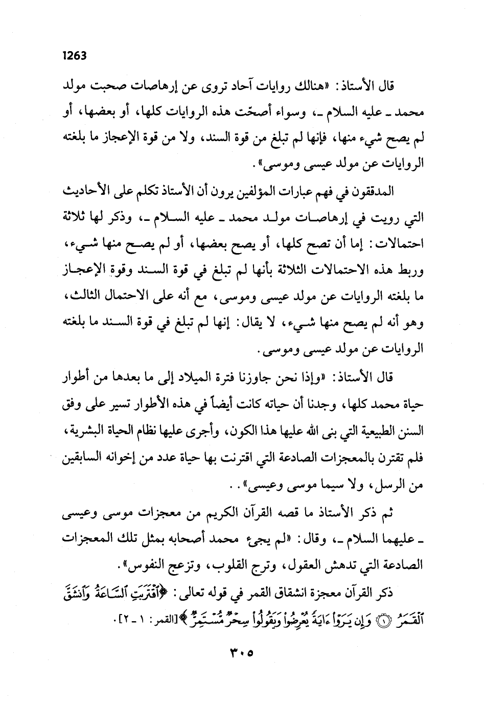 المدققون في فهم عبارات المؤلفين يرون أن الأستاذ تكلم على الأحاديث التي رويت في إرهاصات مولد محمد - عليه السلام -، وذكر لها ثلاثة احتمالات: إما أن تصح كلها، أو يصح بعضها، أو لم يصح منها شيء، وربط هذه الاحتمالات الثلاثة بأنها لم تبلغ في قوة السند وقوة الإعجاز ما بلغته الروايات عن مولد عيسى وموسى، مع أنه على الاحتمال الثالث، وهو أنه لم يصح منها شيء، لا يقال: إنها لم تبلغ في قوة السند ما بلغته الروايات عن مولد عيسى وموسى.