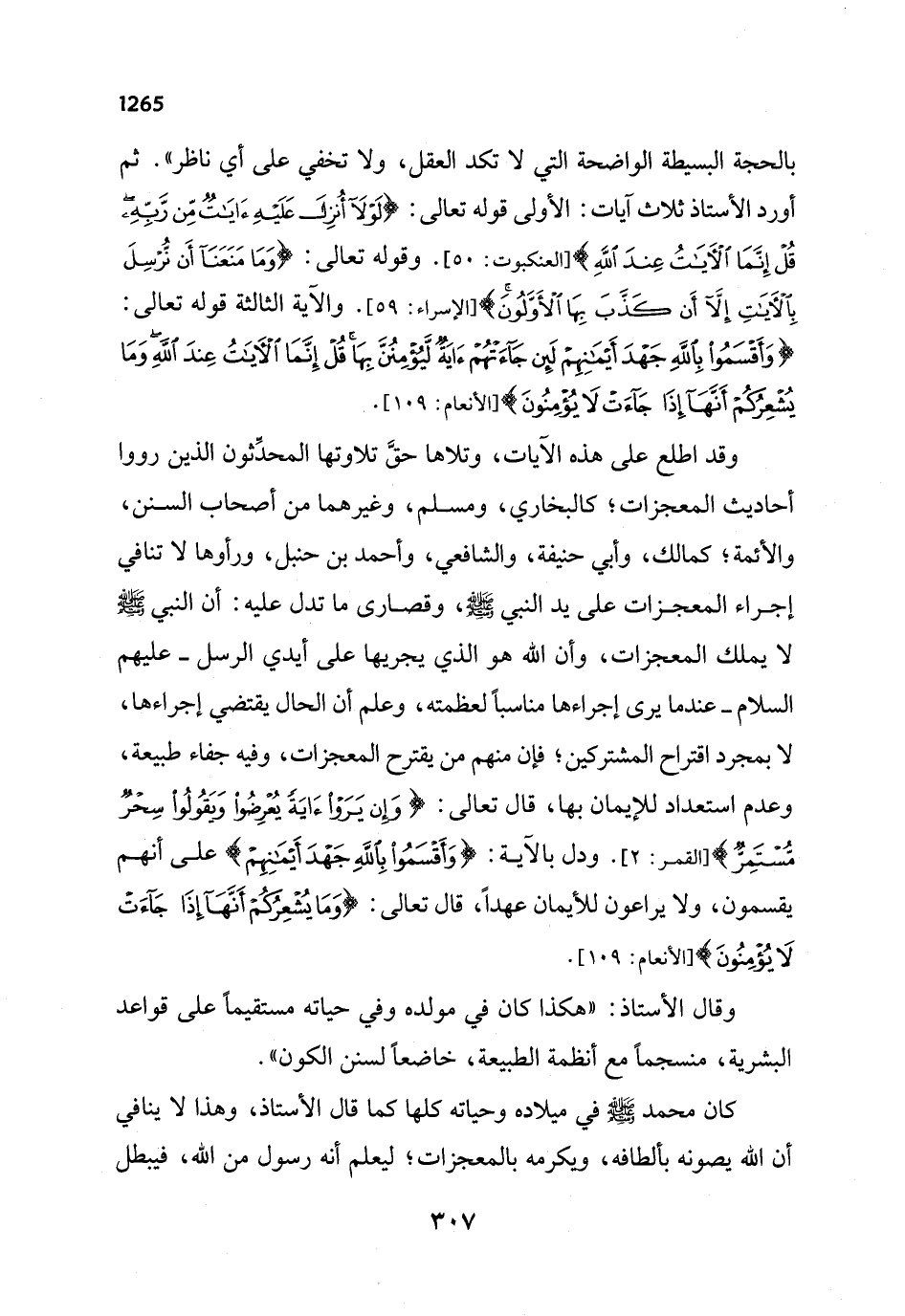 بالحجة البسيطة الواضحة التي لا تكد العقل، ولا تخفي على أي ناظر". ثم أورد الأستاذ ثلاث آيات: الأولى قوله تعالى: {لَوْلَا أُنْزِلَ عَلَيْهِ آيَاتٌ مِنْ رَبِّهِ قُلْ إِنَّمَا الْآيَاتُ عِنْدَ اللَّهِ} [العنكبوت: 50]. وقوله تعالى: {وَمَا مَنَعَنَا أَنْ نُرْسِلَ بِالْآيَاتِ إِلَّا أَنْ كَذَّبَ بِهَا الْأَوَّلُونَ} [الإسراء: 59]. والآية الثالثة قوله تعالى: {وَأَقْسَمُوا بِاللَّهِ جَهْدَ أَيْمَانِهِمْ لَئِنْ جَاءَتْهُمْ آيَةٌ لَيُؤْمِنُنَّ بِهَا قُلْ إِنَّمَا الْآيَاتُ عِنْدَ اللَّهِ وَمَا يُشْعِرُكُمْ أَنَّهَا إِذَا جَاءَتْ لَا يُؤْمِنُونَ} [الأنعام: 109].