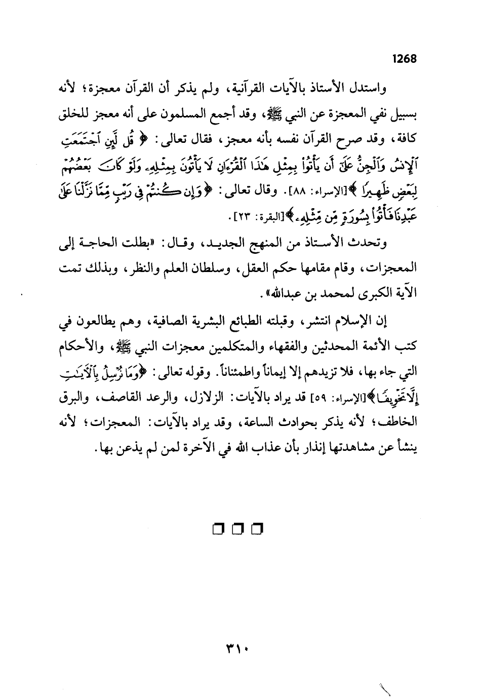 واستدل الأستاذ بالآيات القرآنية، ولم يذكر أن القرآن معجزة؛ لأنه بسبيل نفي المعجزة عن النبي - صلى الله عليه وسلم -، وقد أجمع المسلمون على أنه معجز للخلق كافة، وقد صرح القرآن نفسه بأنه معجز، فقال تعالى: {قُلْ لَئِنِ اجْتَمَعَتِ الْإِنْسُ وَالْجِنُّ عَلَى أَنْ يَأْتُوا بِمِثْلِ هَذَا الْقُرْآنِ لَا يَأْتُونَ بِمِثْلِهِ وَلَوْ كَانَ بَعْضُهُمْ لِبَعْضٍ ظَهِيرًا} [الإسراء: 88]. وقال تعالى: {وَإِنْ كُنْتُمْ فِي رَيْبٍ مِمَّا نَزَّلْنَا عَلَى عَبْدِنَا فَأْتُوا بِسُورَةٍ مِنْ مِثْلِهِ} [البقرة: 23].