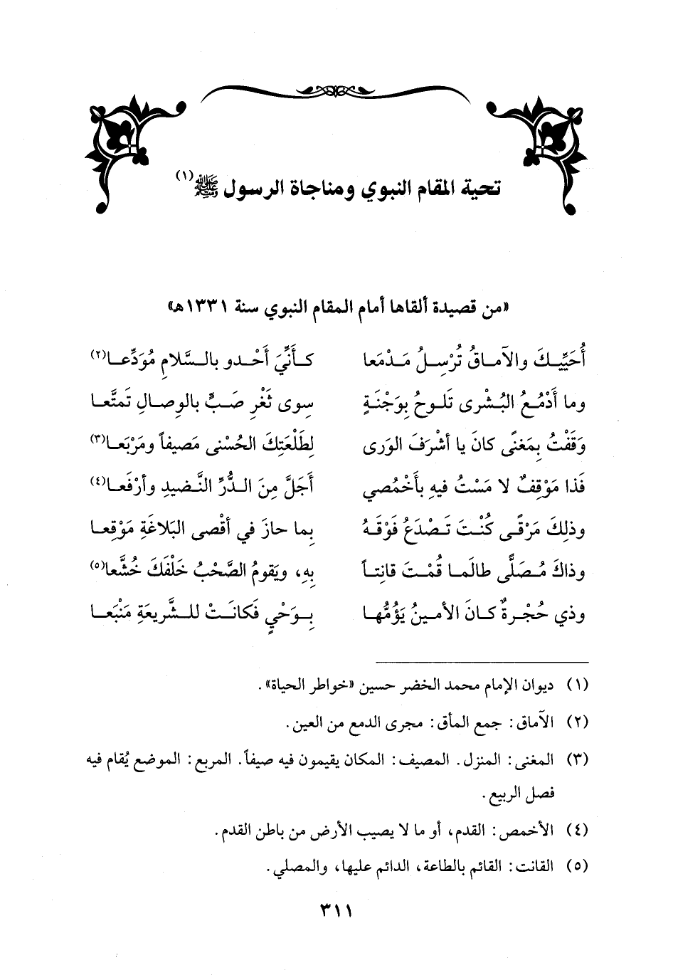 " من قصيدة ألقاها أمام المقام النبوي سنة 1331 هـ"