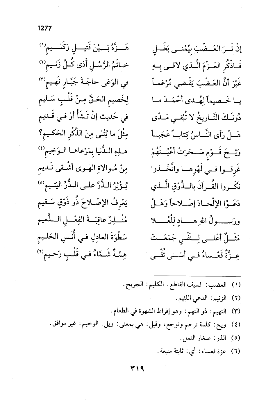 فاذْكُرِ العَزْمَ الَّذي لاقى بِهِ ... خاتَمُ الرُّسْلِ أَذى كُلِّ زَنيمِ (¬2)