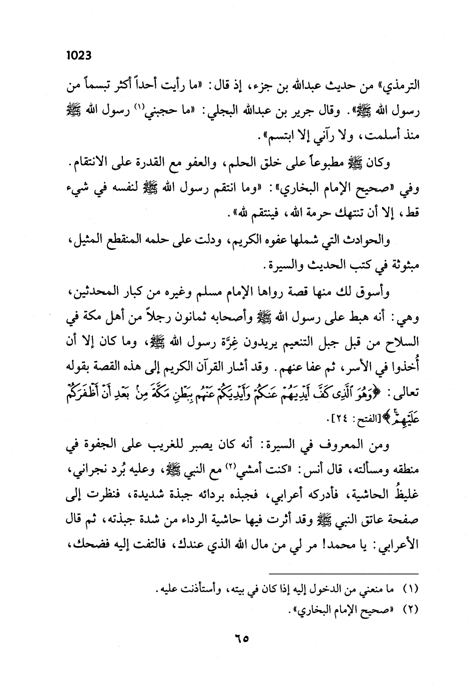 وكان - صلى الله عليه وسلم - مطبوعاً على خلق الحلم، والعفو مع القدرة على الانتقام. وفي" صحيح الإمام البخاري ": "وما انتقم رسول الله - صلى الله عليه وسلم - لنفسه في شيء قط، إلا أن تنتهك حرمة الله، فينتقم لله".