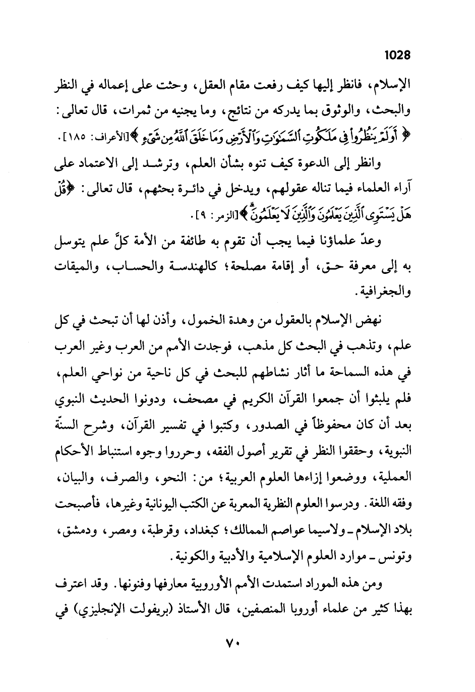نهض الإسلام بالعقول من وهدة الخمول، وأذن لها أن تبحث في كل علم، وتذهب في البحث كل مذهب، فوجدت الأمم من العرب وغير العرب في هذه السماحة ما أثار نشاطهم للبحث في كل ناحية من نواحي العلم، فلم يلبثوا أن جمعوا القرآن الكريم في مصحف، ودونوا الحديث النبوي بعد أن كان محفوظاً في الصدور، وكتبوا في تفسير القرآن، وشرح السنّة النبوية، وحققوا النظر في تقرير أصول الفقه، وحرروا وجوه استنباط الأحكام العملية، ووضعوا إزاءها العلوم العربية؛ من: النحو، والصرف، والبيان، وفقه اللغة. ودرسوا العلوم النظرية المعربة عن الكتب اليونانية وغيرها، فاصبحت بلاد الإسلام- ولاسيما عواصم الممالك؛ كبغداد، وقرطبة، ومصر، ودمشق، وتونس - موارد العلوم الإسلامية والأدبية والكونية.