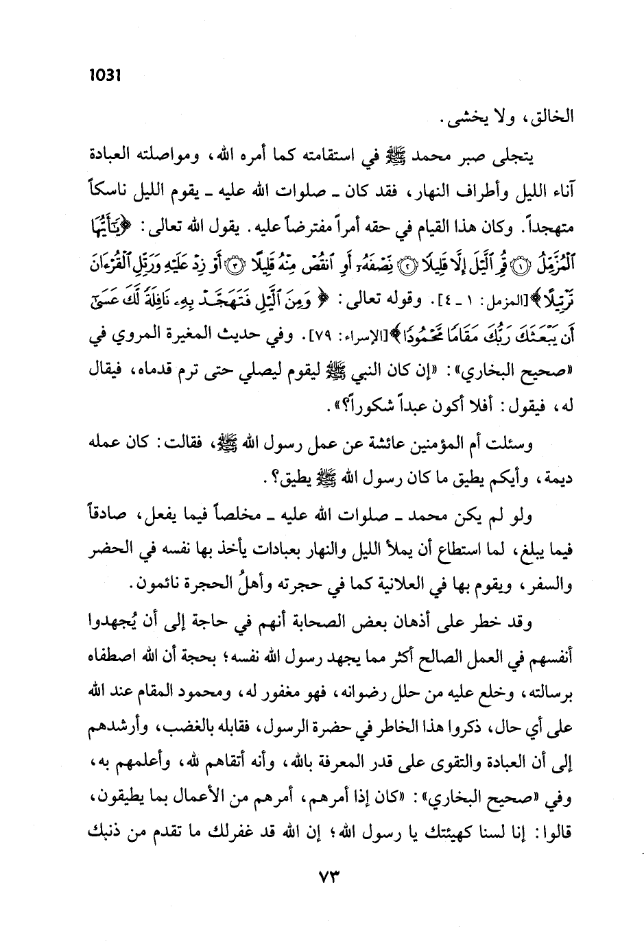 وقد خطر على أذهان بعض الصحابة أنهم في حاجة إلى أن يُجهدوا أنفسهم في العمل الصالح أكثر مما يجهد رسول الله نفسه؛ بحجة أن الله اصطفاه برسالته، وخلع عليه من حلل رضوانه، فهو مغفور له، ومحمود المقام عند الله على أي حال، ذكروا هذا الخاطر في حضرة الرسول، فقابله بالغضب، وأرشدهم إلى أن العبادة والتقوى على قدر المعرفة بالله، وأنه أتقاهم لله، وأعلمهم به، وفي "صحيح البخاري": "كان إذا أمرهم، أمرهم من الأعمال بما يطيقون، قالوا: إنا لسنا كهيئتك يا رسول الله؛ إن الله قد غفر لك ما تقدم من ذنبك