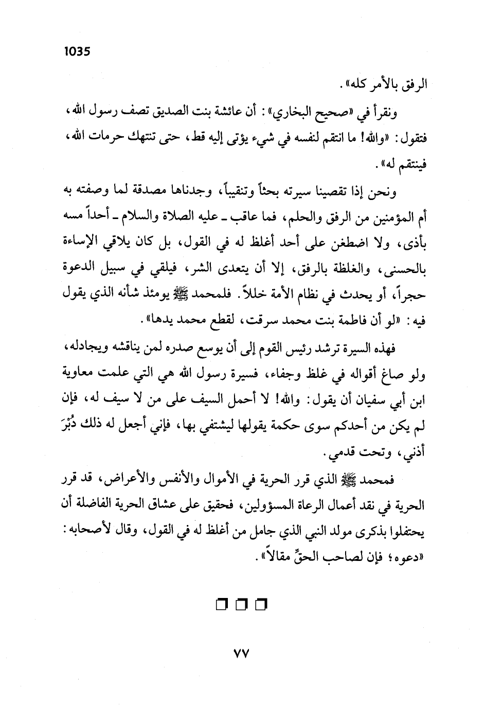 فمحمد - صلى الله عليه وسلم - الذي قرر الحرية في الأموال والأنفس والأعراض، قد قرر الحرية في نقد أعمال الرعاة المسؤولين، فحقيق على عشاق الحرية الفاضلة أن يحتفلوا بذكرى مولد النبي الذي جامل من أغلظ له في القول، وقال لأصحابه: "دعوه؛ فإن لصاحب الحقِّ مقالاً".
