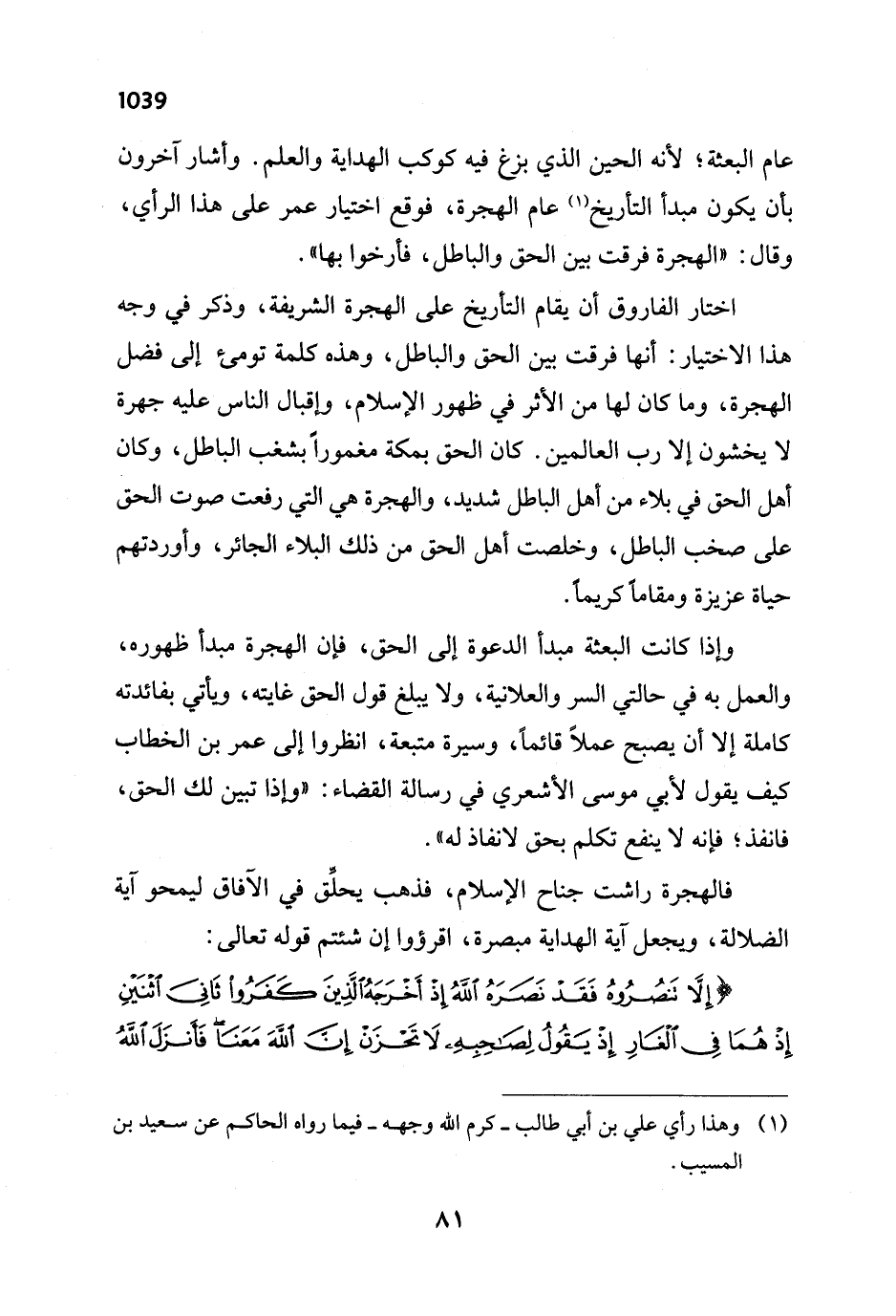 وإذا كانت البعثة مبدأ الدعوة إلى الحق، فإن الهجرة مبدأ ظهوره، والعمل به في حالتي السر والعلانية، ولا يبلغ قول الحق غايته، ويأتي بفائدته كاملة إلا أن يصبح عملاً قائماً، وسيرة متبعة، انظروا إلى عمر بن الخطاب كيف يقول لأبي موسى الأشعري في رسالة القضاء: "وإذا تبين لك الحق، فانفذ؛ فإنه لاينفع تكلم بحق لا نفاذ له".