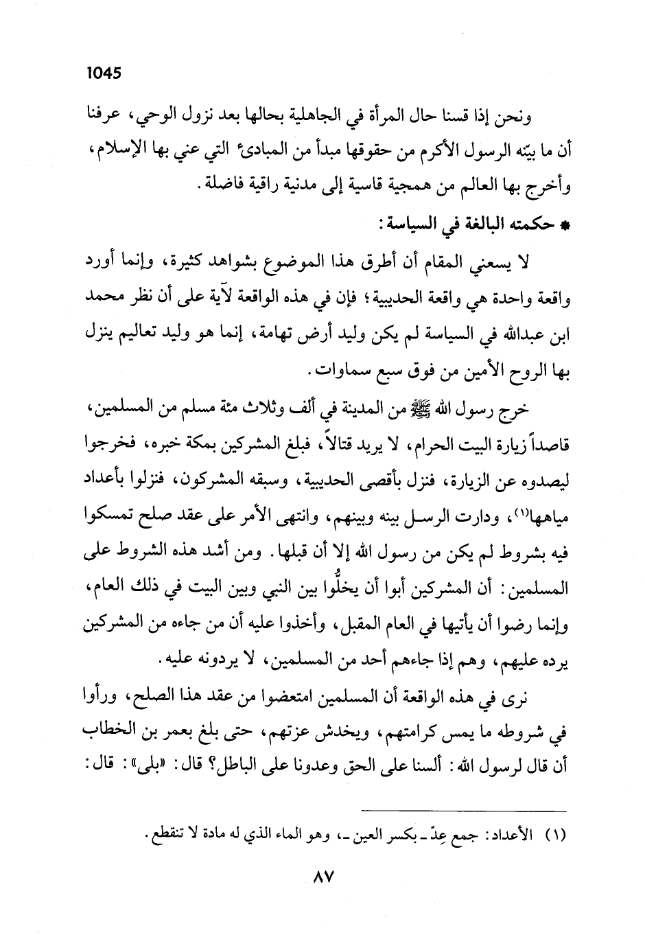 لا يسعني المقام أن أطرق هذا الموضوع بشواهد كثيرة، وإنما أورد واقعة واحدة هي واقعة الحديبية؛ فإن في هذه الواقعة لآية على أن نظر محمد ابن عبد الله في السياسة لم يكن وليد أرض تهامة، إنما هو وليد تعاليم ينزل بها الروح الأمين من فوق سبع سماوات.