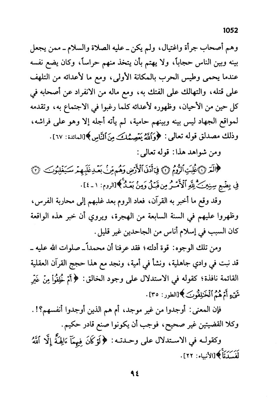 ومن تلك الوجوه: قوة أدلته؛ فقد عرفنا أن محمداً - صلوات الله عليه - قد نبت في وادي جاهلية، ونشأ في أمية، ونجد مع هذا حجج القرآن العقلية القائمة نافذة، كقوله في الاستدلال على وجود الخالق: {أَمْ خُلِقُوا مِنْ غَيْرِ شَيْءٍ أَمْ هُمُ الْخَالِقُونَ} [الطور: 35].