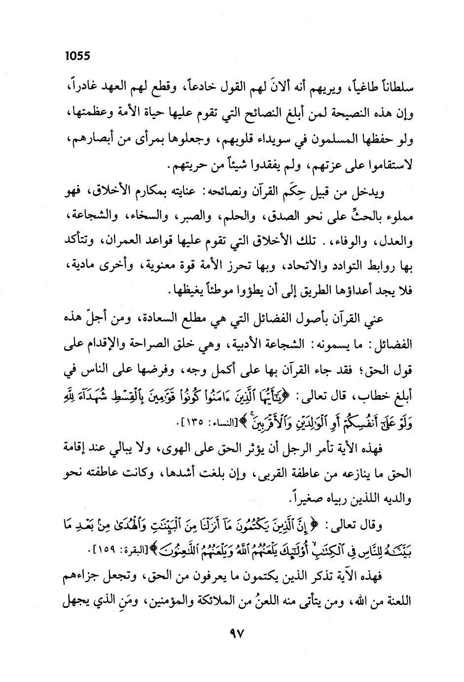 عني القرآن بأصول الفضائل التي هي مطلع السعادة، ومن أجلّ هذه الفضائل: ما يسمونه: الشجاعة الأدبية، وهي خلق الصراحة والإقدام على قول الحق؛ فقد جاء القرآن بها على كمل وجه، وفرضها على الناس في أبلغ خطاب، قال تعالى: {يَاأَيُّهَا الَّذِينَ آمَنُوا كُونُوا قَوَّامِينَ بِالْقِسْطِ شُهَدَاءَ لِلَّهِ وَلَوْ عَلَى أَنْفُسِكُمْ أَوِ الْوَالِدَيْنِ وَالْأَقْرَبِينَ} [النساء: 135].