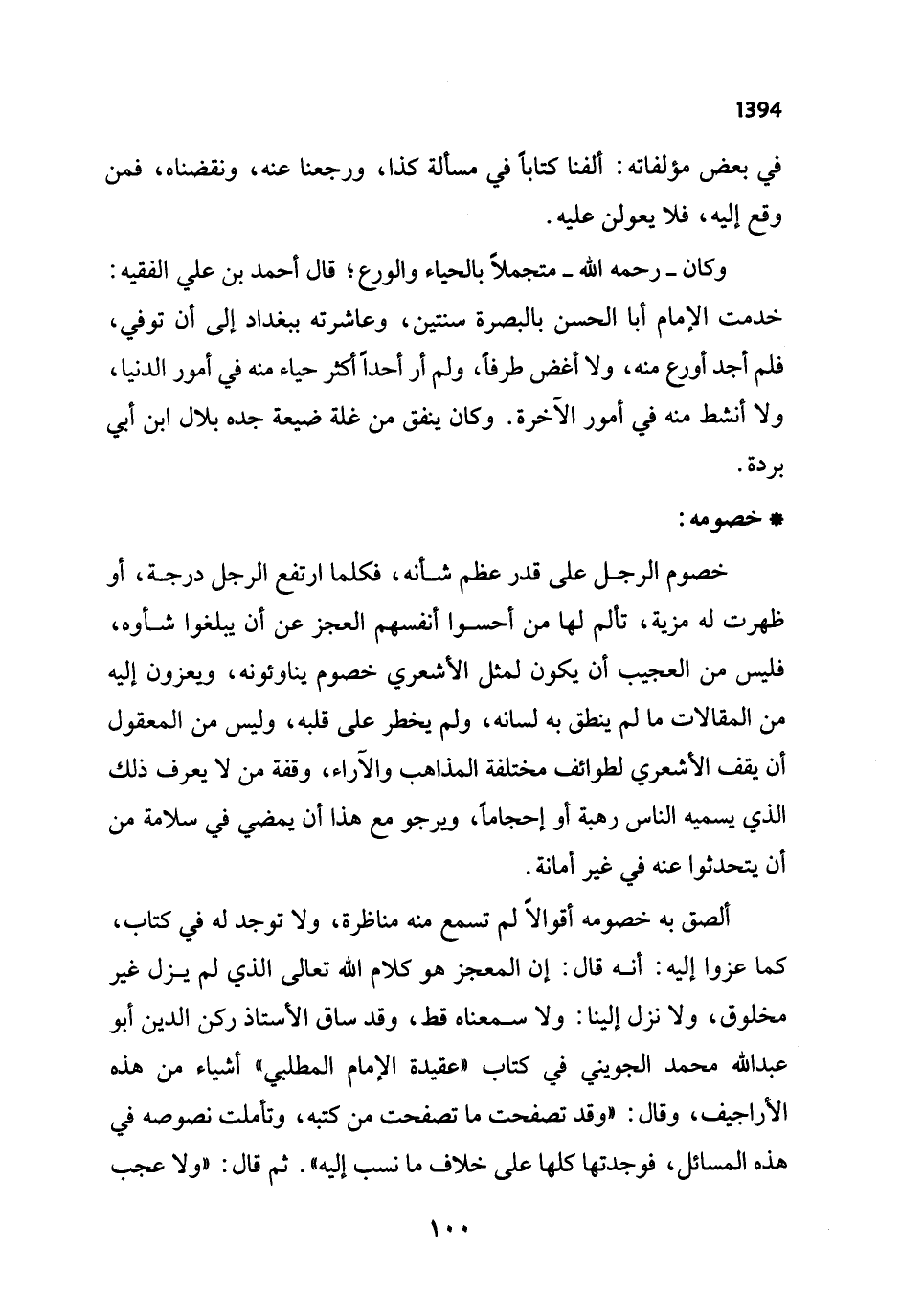 ألصق به خصومه أقوالاً لم تسمع منه مناظرة، ولا توجد له في كتاب، كما عزوا إليه: أنه قال: إن المعجز هو كلام الله تعالى الذي لم يزل غير مخلوق، ولا نزل إلينا: ولا سمعناه قط، وقد ساق الأستاذ ركن الدين أبو عبد الله محمد الجويني في كتاب "عقيدة الإمام المطلبي" أشياء من هذه الأراجيف، وقال: "وقد تصفحت ما تصفحت من كتبه، وتاملت نصوصه في هذه المسائل، فوجدتها كلها على خلاف ما نسب إليه". ثم قال: "ولا عجب