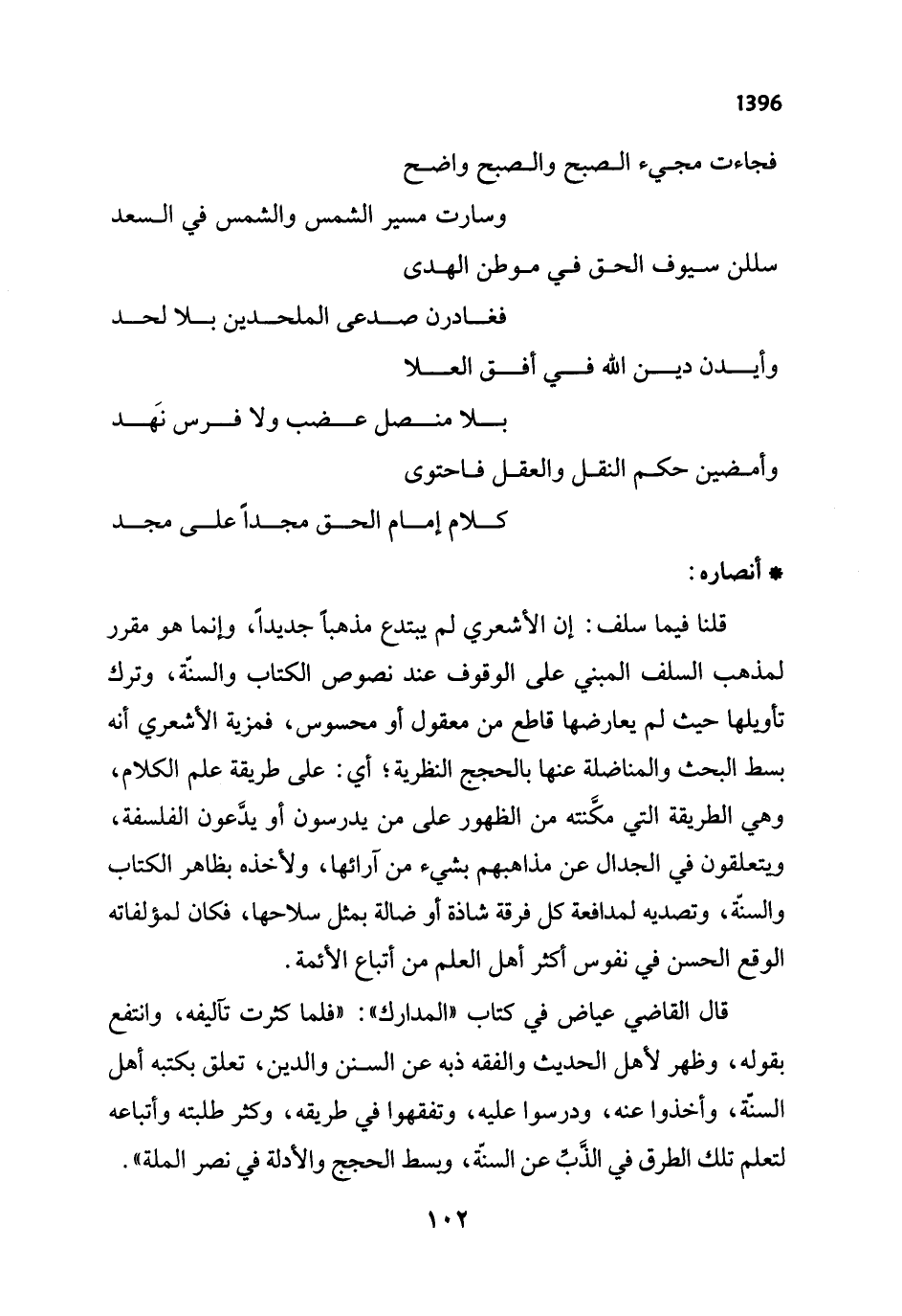 قلنا فيما سلف: إن الأشعري لم يبتدع مذهباً جديداً، وإنما هو مقرر لمذهب السلف المبني على الوقوف عند نصوص الكتاب والسنّة، وترك تأويلها حيث لم يعارضها قاطع من معقول أو محسوس، فمزية الأشعري أنه بسط البحث والمناضلة عنها بالحجج النظرية؛ أي: على طريقة علم الكلام، وهي الطريقة التي مكَّنته من الظهور على من يدرسون أو يدَّعون الفلسفة، ويتعلقون في الجدال عن مذاهبهم بشيء من آرائها، ولأخذه بظاهر الكتاب والسنّة، وتصديه لمدافعة كل فرقة شاذة أو ضالة بمثل سلاحها، فكان لمؤلفاته الوقع الحسن في نفوس أكثر أهل العلم من أتباع الأئمة.