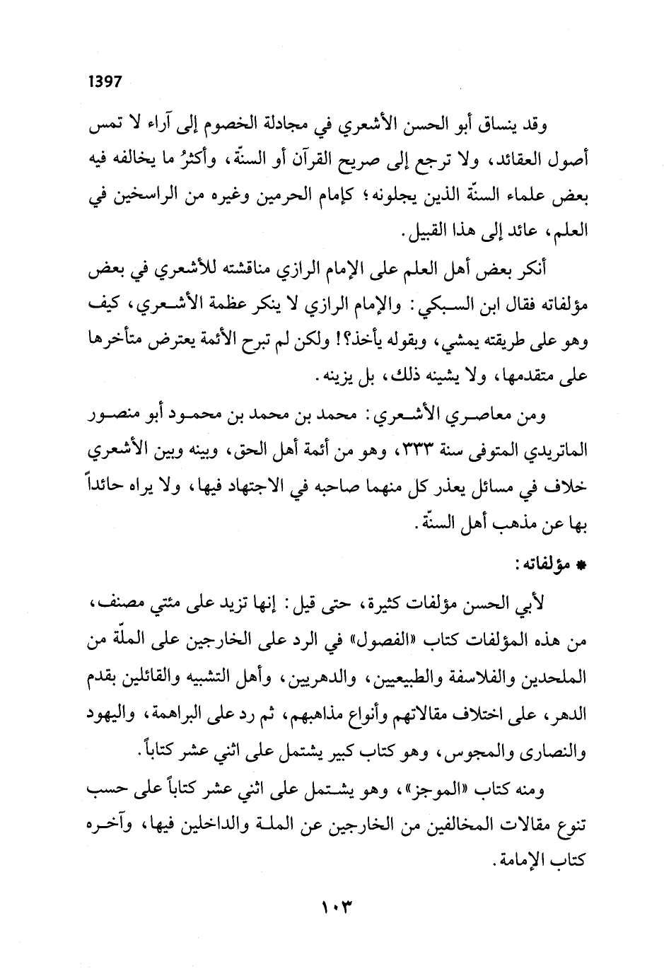 وقد ينساق أبو الحسن الأشعري في مجادلة الخصوم إلى آراء لا تمس أصول العقائد، ولا ترجع إلى صريح القرآن أو السنّة، وأكثرُ ما يخالفه فيه بعض علماء السنّة الذين يجلونه؛ كإمام الحرمين وغيره من الراسخين في العلم، عائد إلى هذا القبيل.